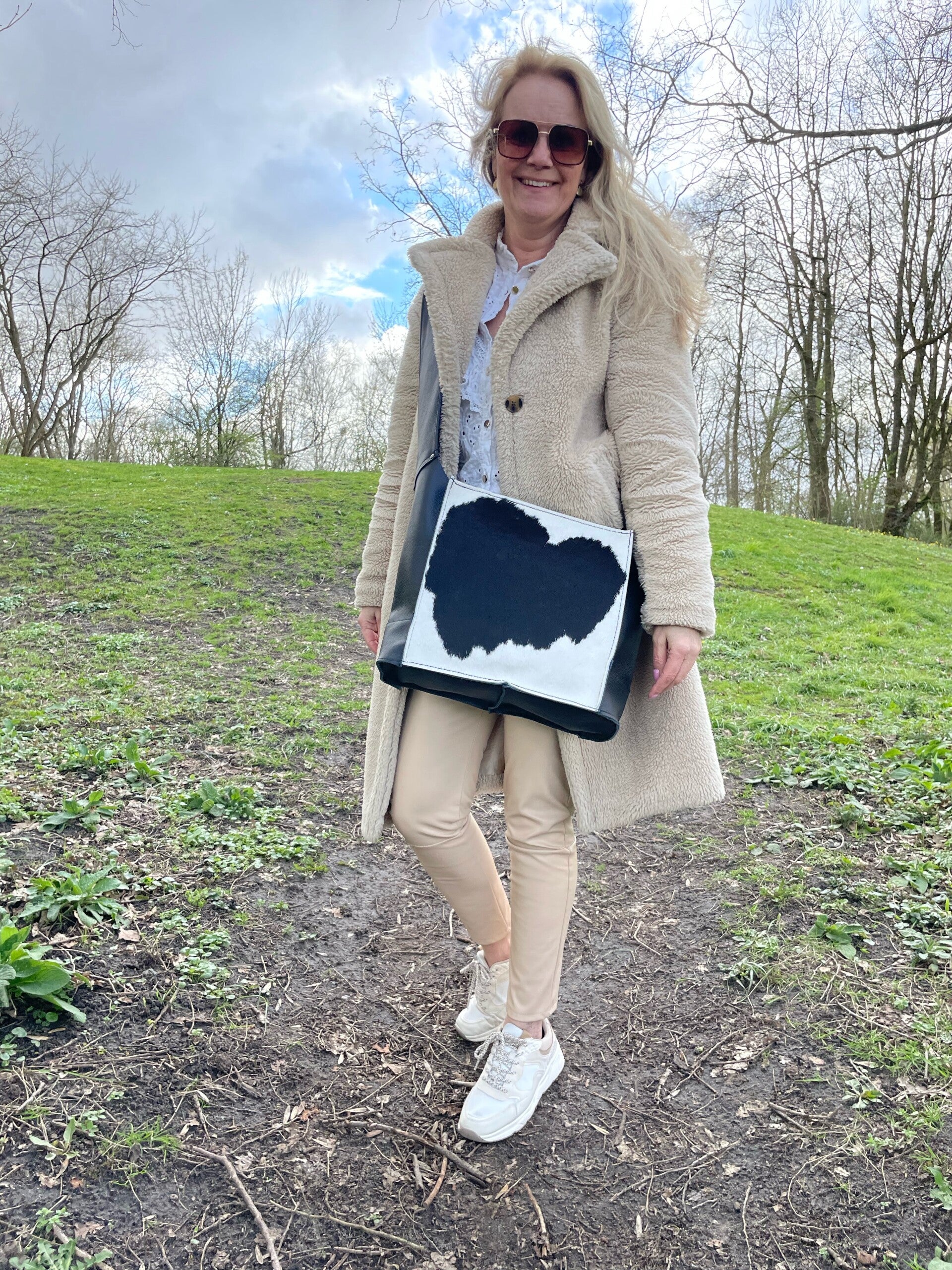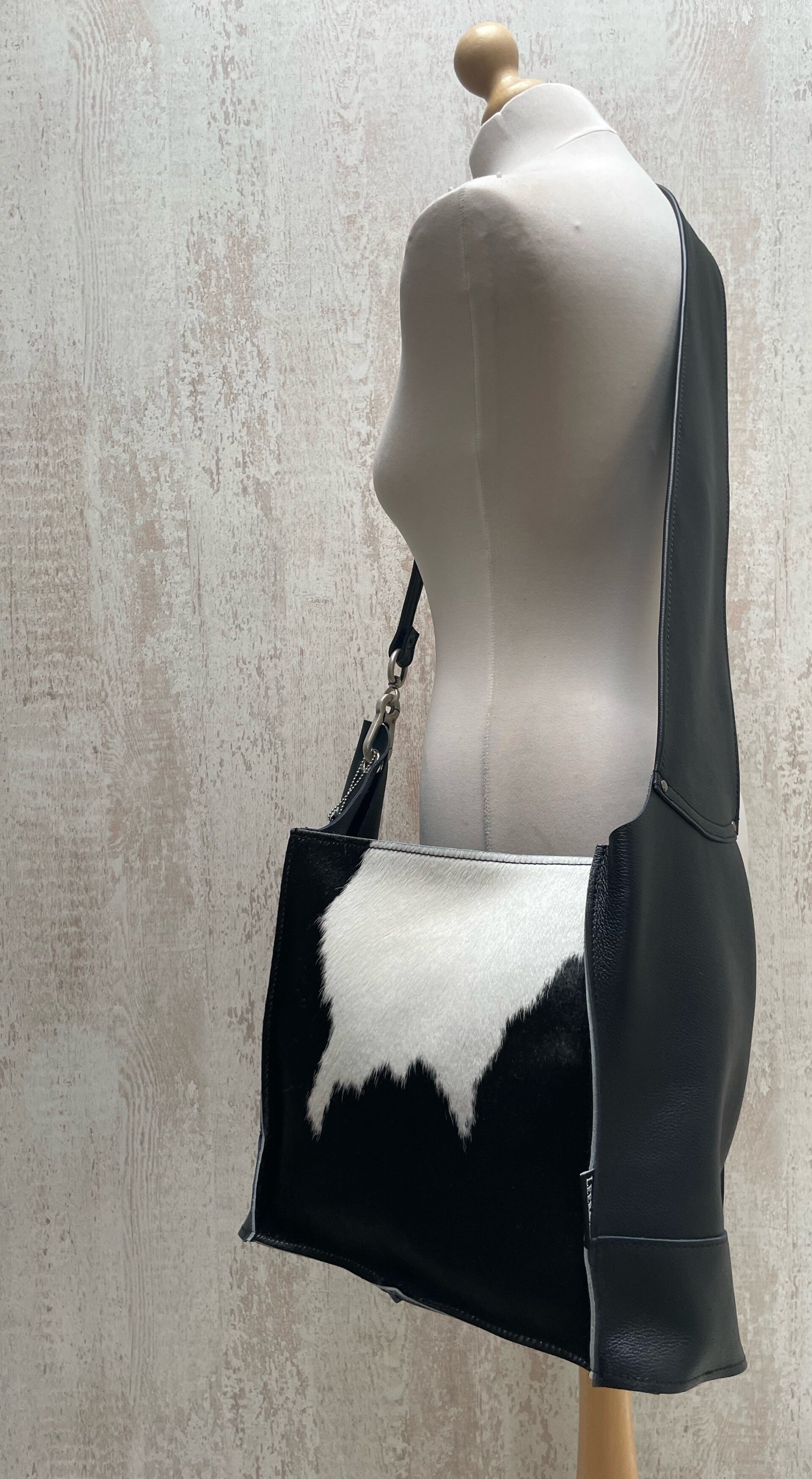 Schitterende handgemaakte stoere ruime leren schoudertas. De tas is gemaakt van mooi zwart leer met op de voor en achterzijde zwart/wit koeienhuid. Leuk detail is het hartje op de achterzijde! De tas is cross-over te dragen en sluit met een stevige YKK rits. En is voorzien van een brede schouderband met aan het uiteinde een mooie stoere grove karabijnhaak.