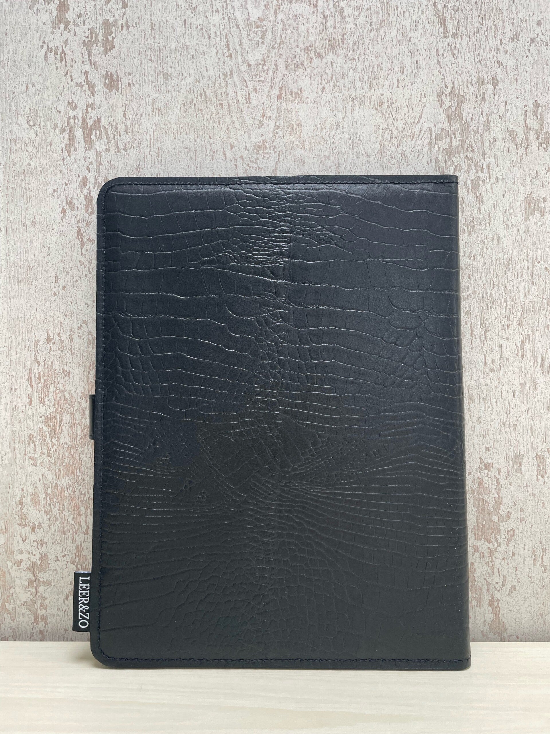 Prachtige stoere en stijlvolle zwart lederen schrijfmap met croco print. Aan de binnenzijde ruimte voor een A4 schrijfblok en aan de linkerzijde is er ruimte voor 2 kaarthouders, zichtvak, groot steekvak voor papieren en in het midden nog een pennenlus. De binnenzijde is van PU leer en de map sluit doormiddel van een magneetsluiting.