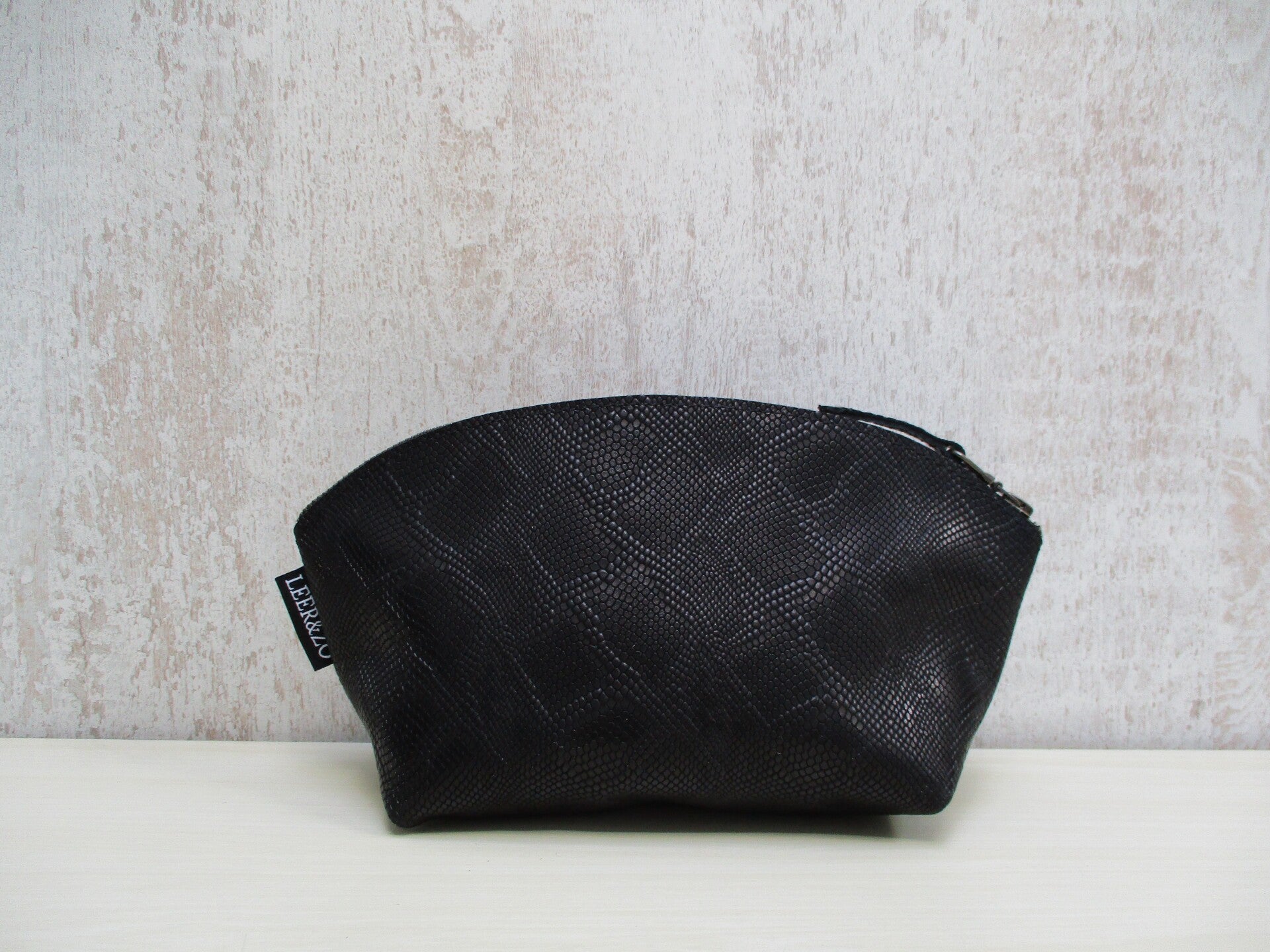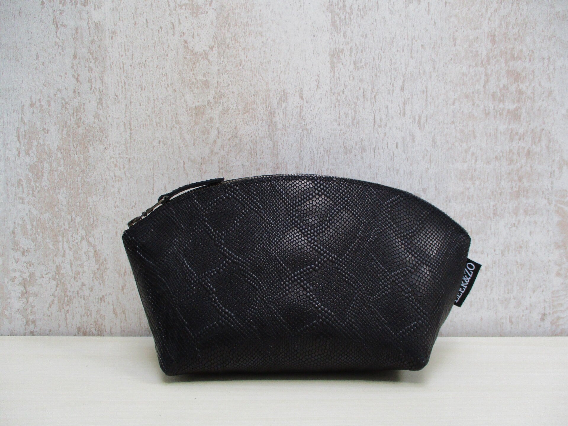 Schitterende handgemaakte ruime leren toilettas van sublieme kwaliteit zwart slangen print. Het is een handig rond model waardoor je een goed overzicht hebt op al je make-up en toilet spulletjes. Door de brede bodem is de toilettas lekker ruim, en aan de bovenzijde voorzien van stevige YKK rits.