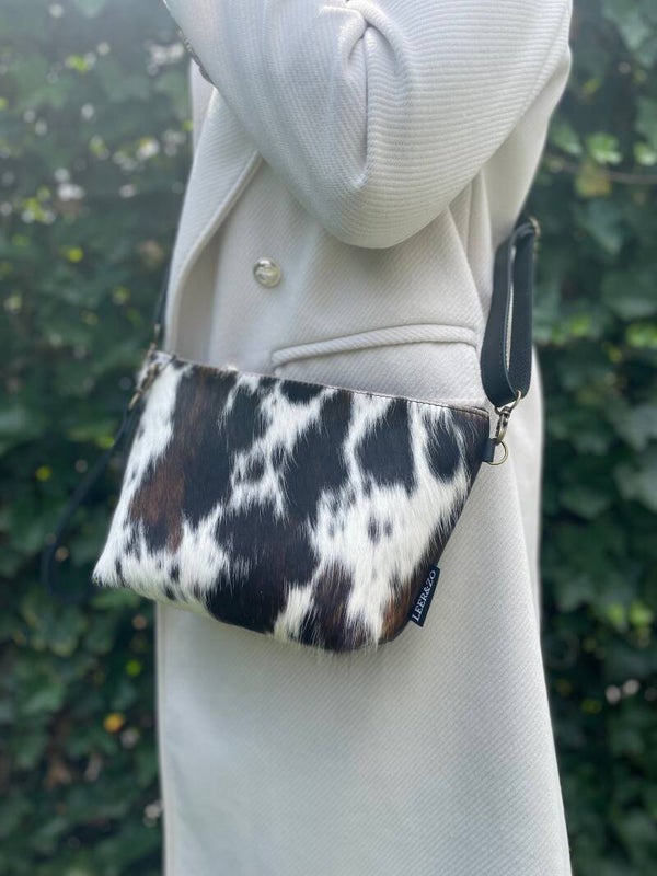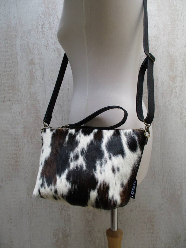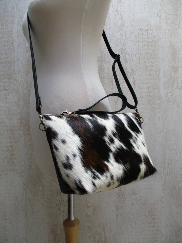 Schitterende schoudertas en clutch in één. Het tas is te gebruiken als handig schoudertas en als stoere grote clutch. De voorzijde is van mooie kwaliteit tricolor koeienhuid en de achterzijde van mooi zwart leer. Schouderband is verstelbaar en voorzien van clips en makkelijk los te halen. Aan de bovenzijde voorzien van een stevige YKK rits.