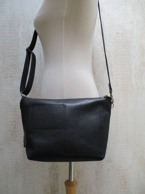 Ruime zwart leren schoudertas met tricolor koeienhuid