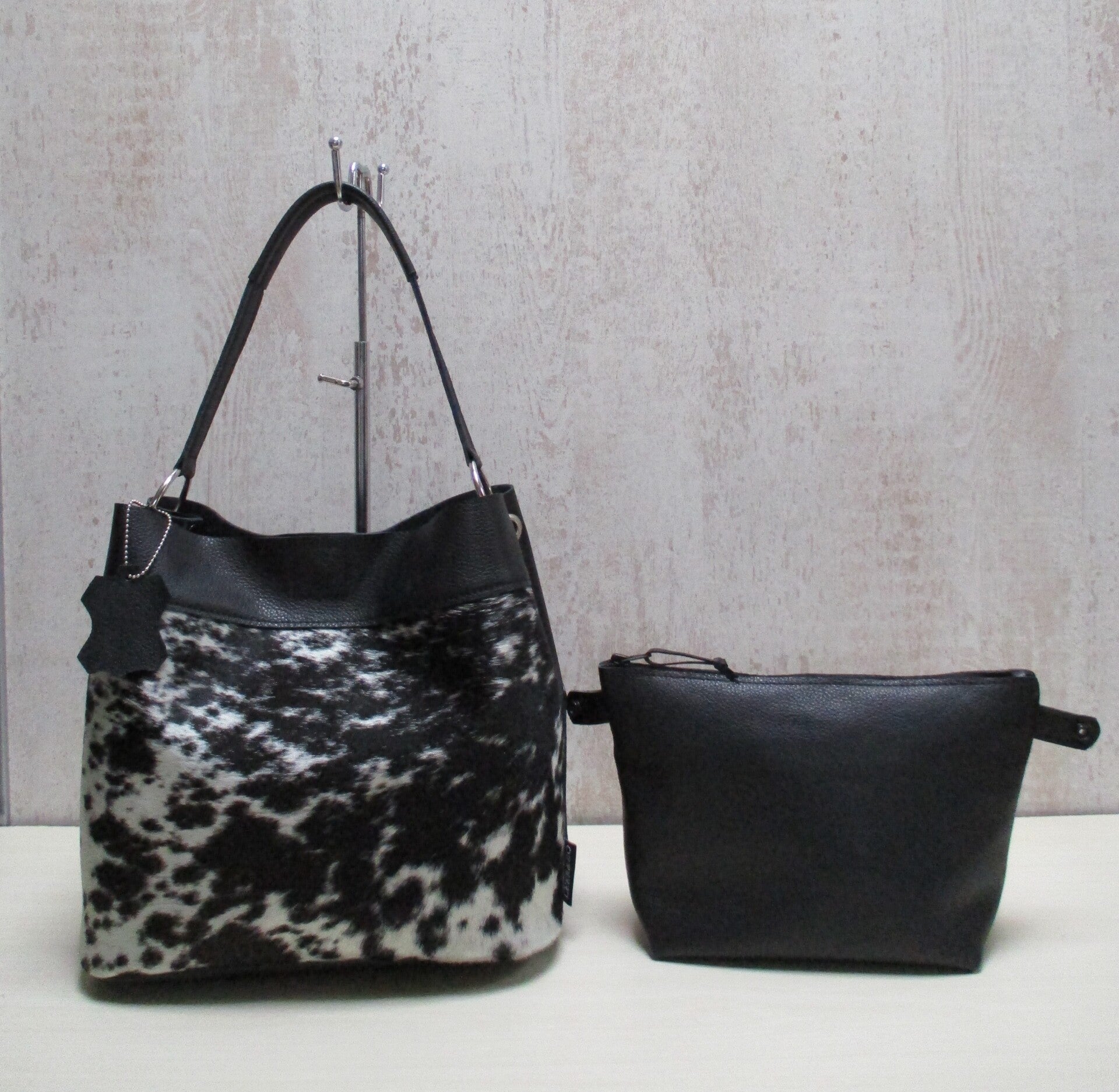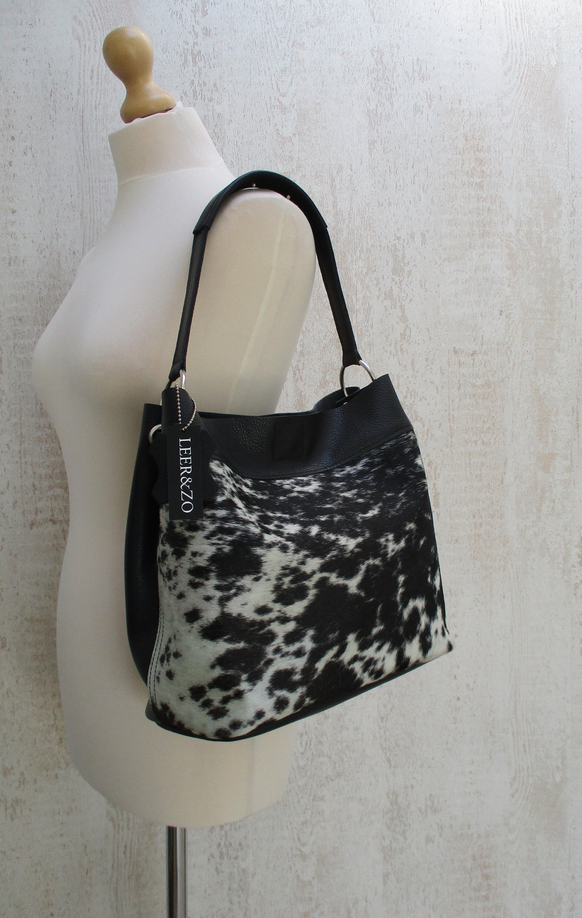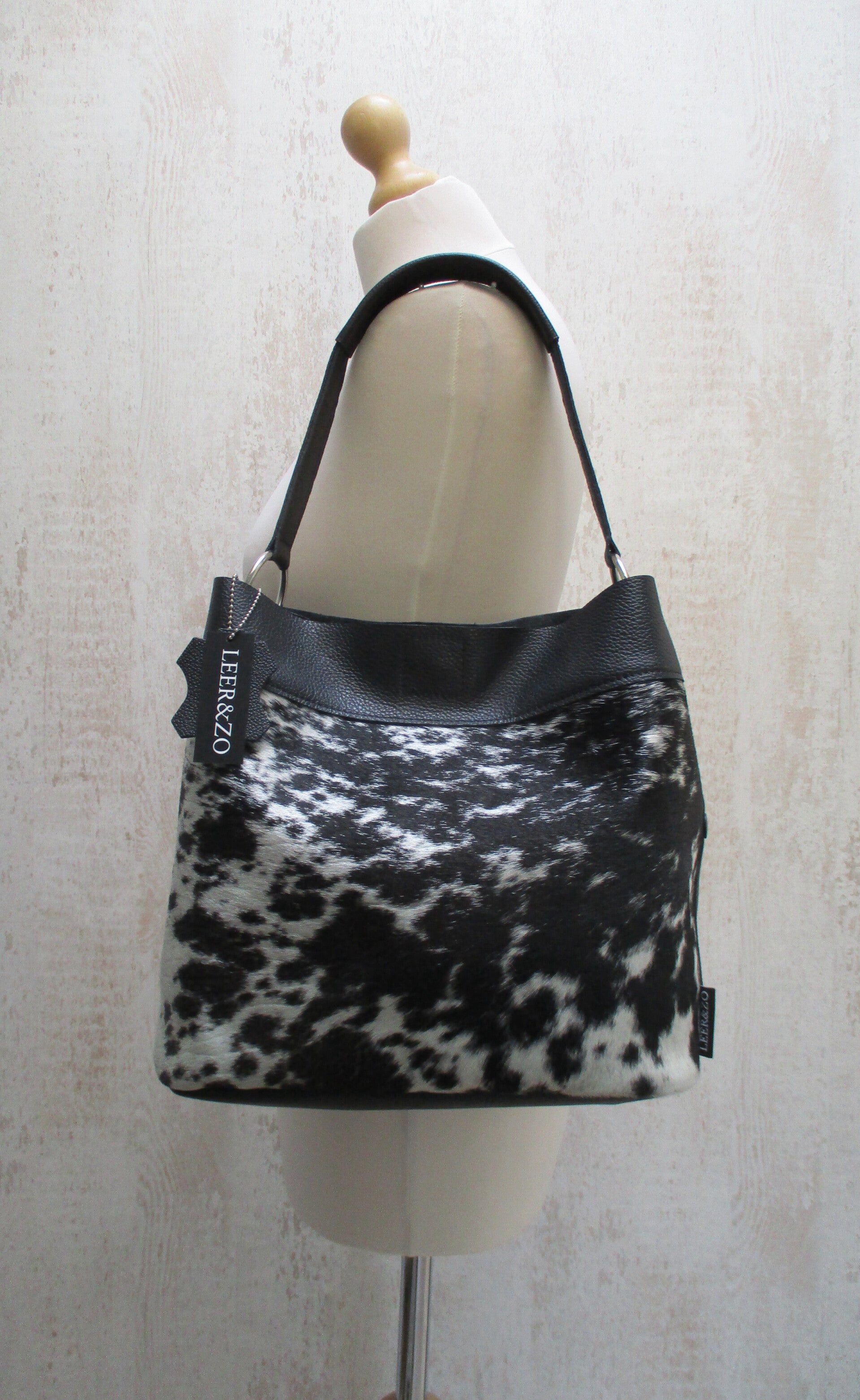 Schitterende buideltas gemaakt van zwart/wit koeienhuid. De achterzijde is van mooi zwart leer. De tas is zowel aan de hand als over de schouder te dragen. En sluit doormiddel van een magneetsluiting aan de bovenzijde. De afmetingen zijn H28 x B30 x D16cm.
