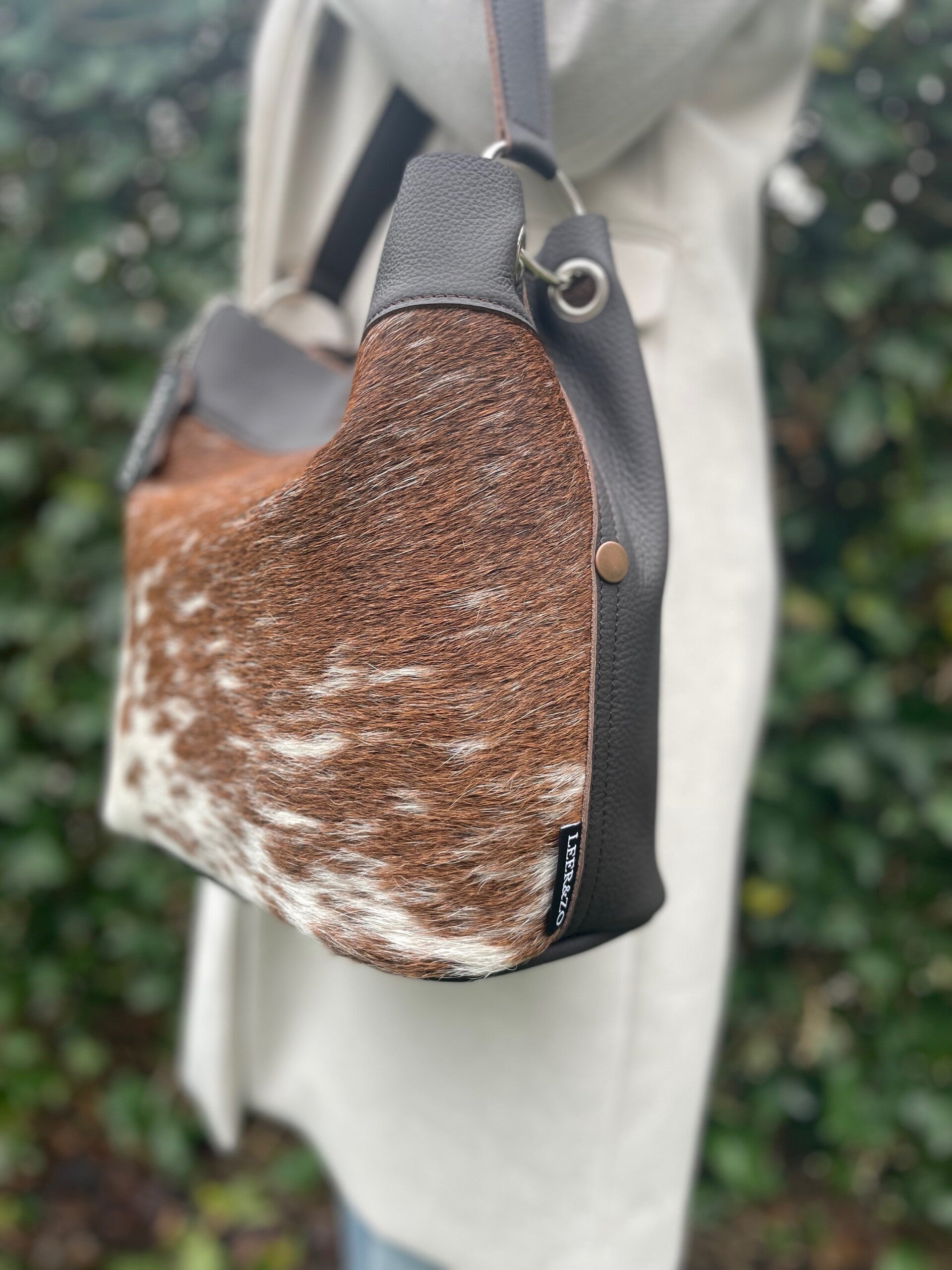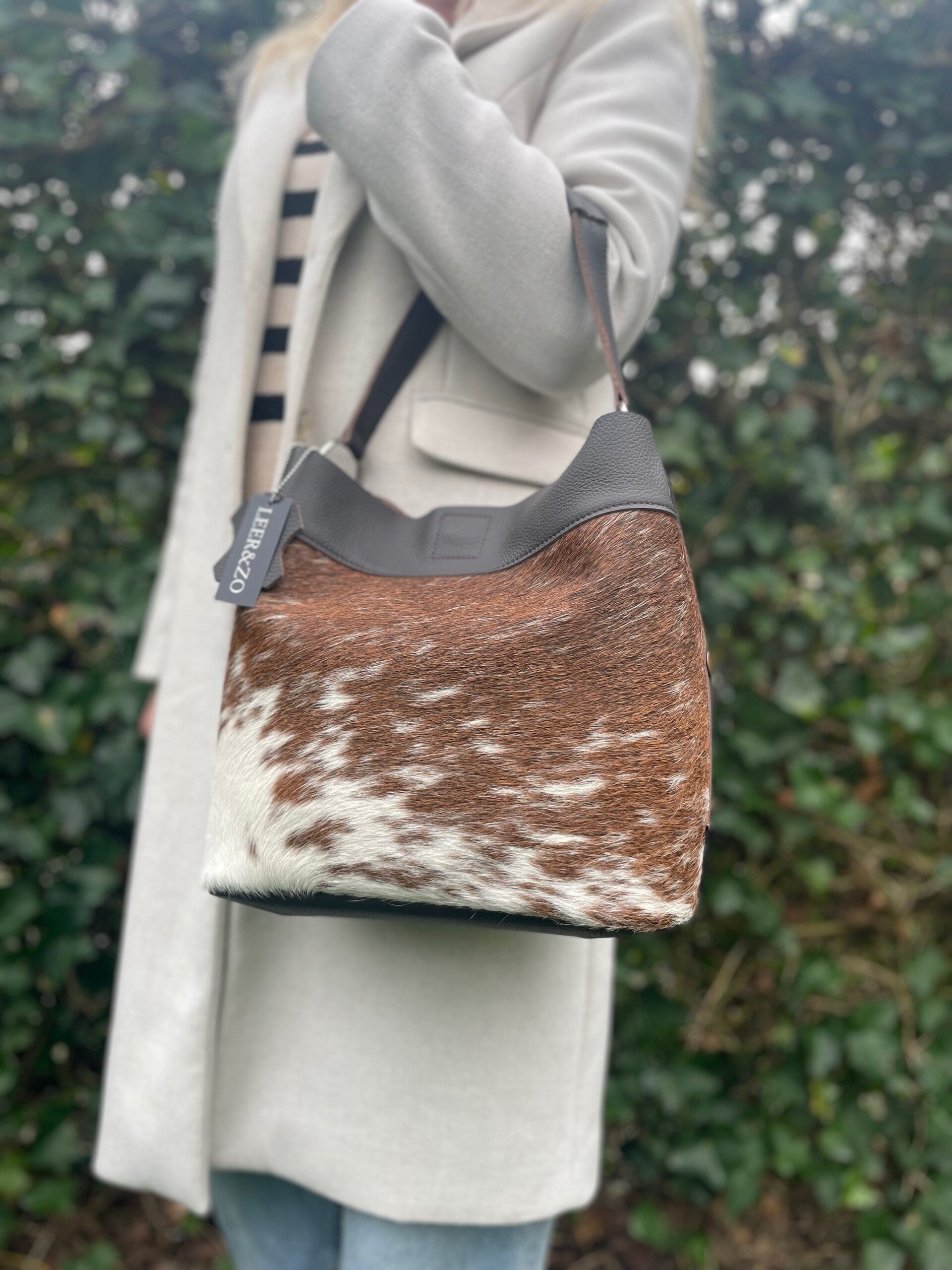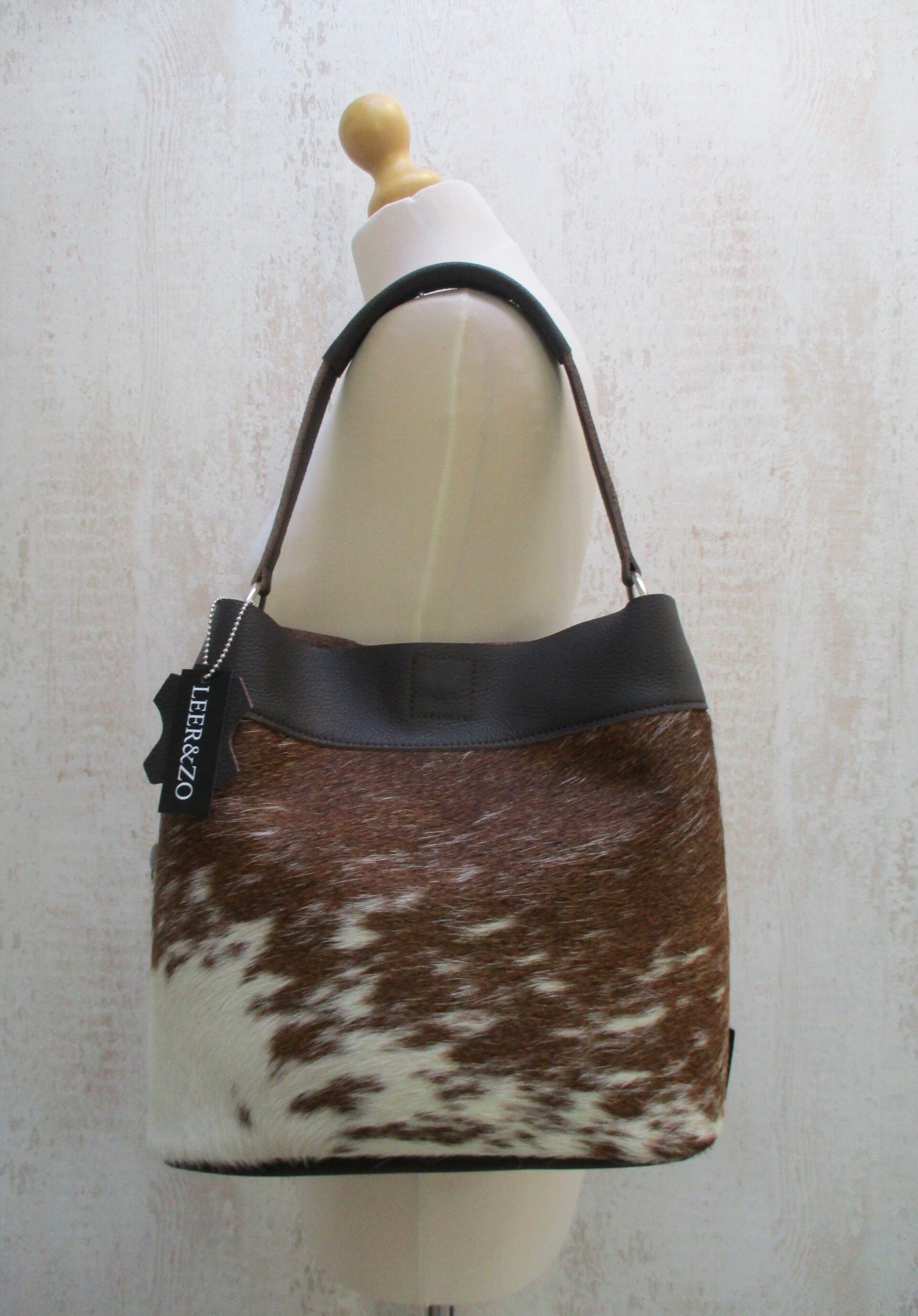 Schitterende donkerbruin leren schoudertas gemaakt met prachtig donkerbruin/wit gevlekte koeienhuid. De achterzijde is van mooi donkerbruin leer. De tas is zowel aan de hand als over de schouder te dragen. En sluit doormiddel van een magneetsluiting aan de bovenzijde. De afmetingen zijn H28 x B30 x D16cm.