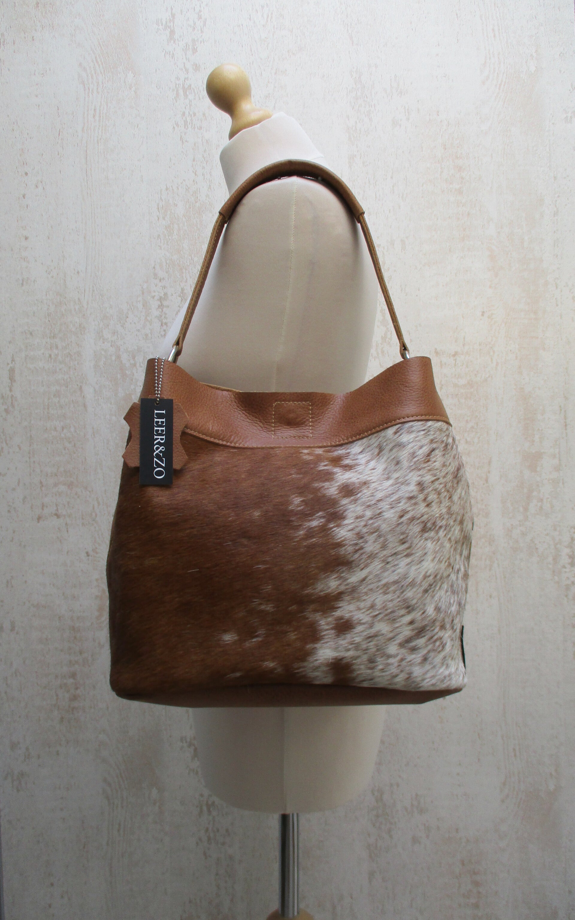 Schitterende buideltas gemaakt van cognac/wit koeienhuid. De achterzijde is van mooi cognac leer. De tas is zowel aan de hand als over de schouder te dragen. En sluit doormiddel van een magneetsluiting aan de bovenzijde. De afmetingen zijn H28 x B30 x D16cm.