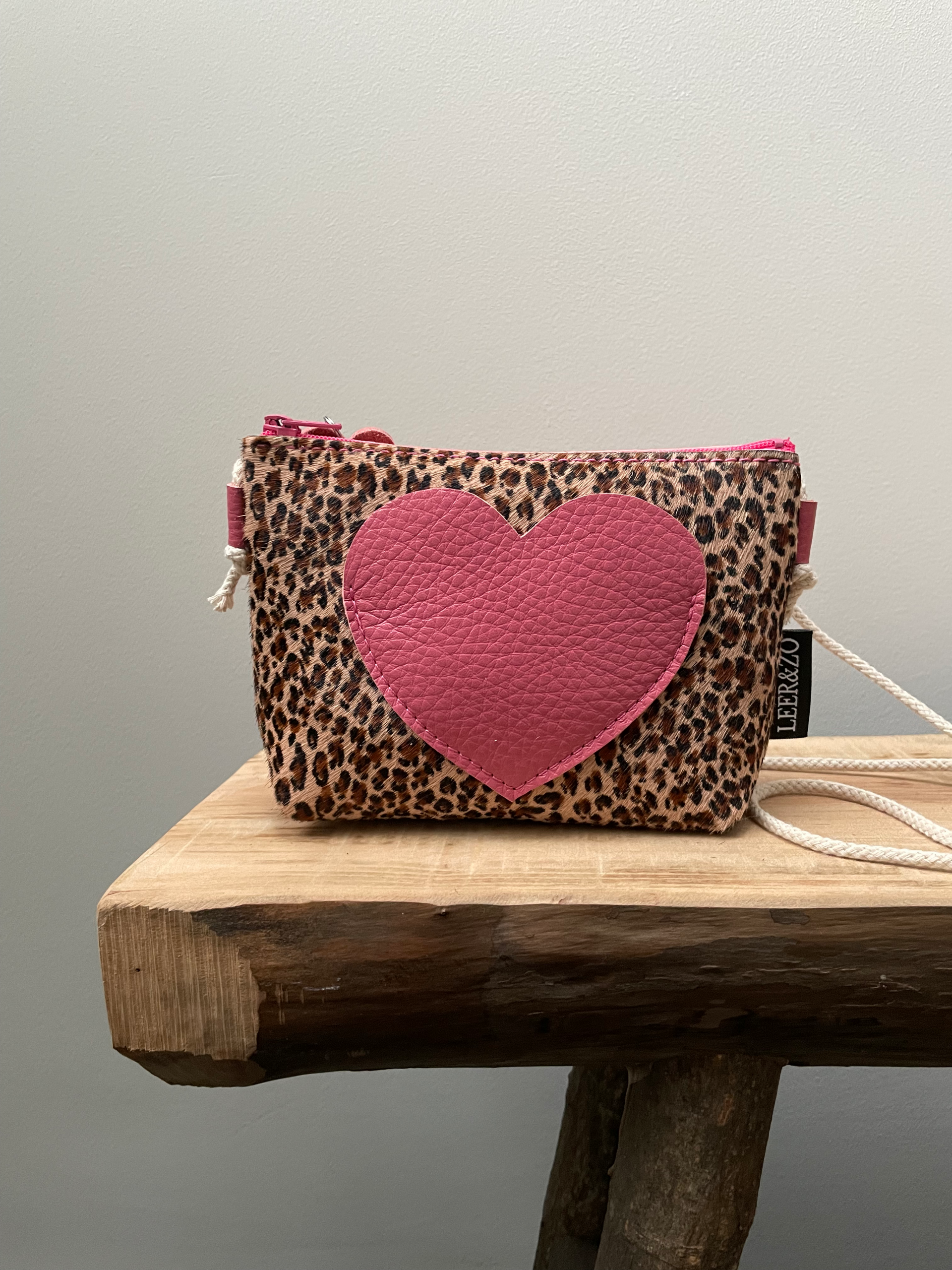 Deze is toch te schattig! Lief klein schoudertasje met op de voorzijde een hartje, wat als vakje gebruikt kan worden. En de achterzijde is van roze leer en sluit aan de bovenzijde met rits.