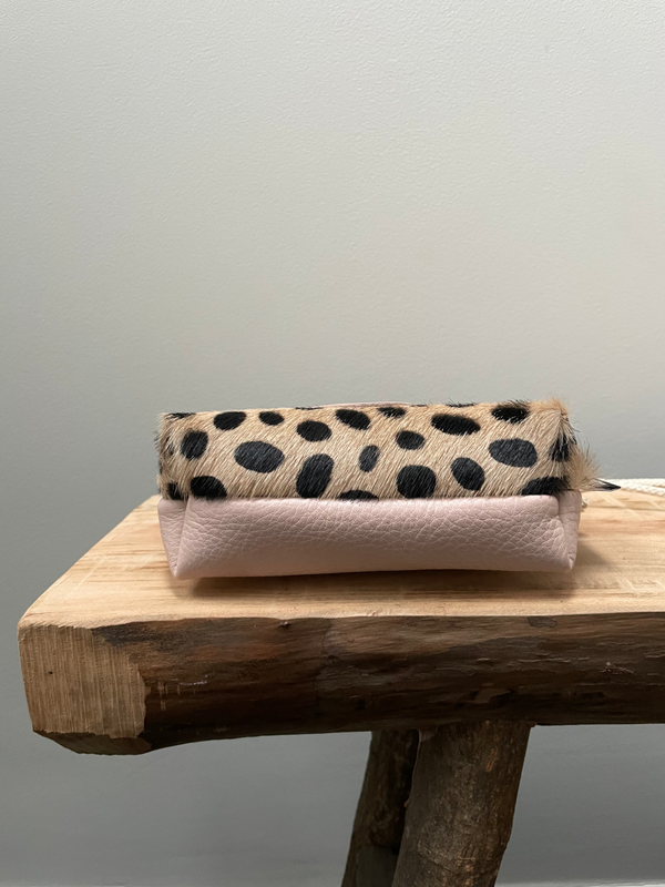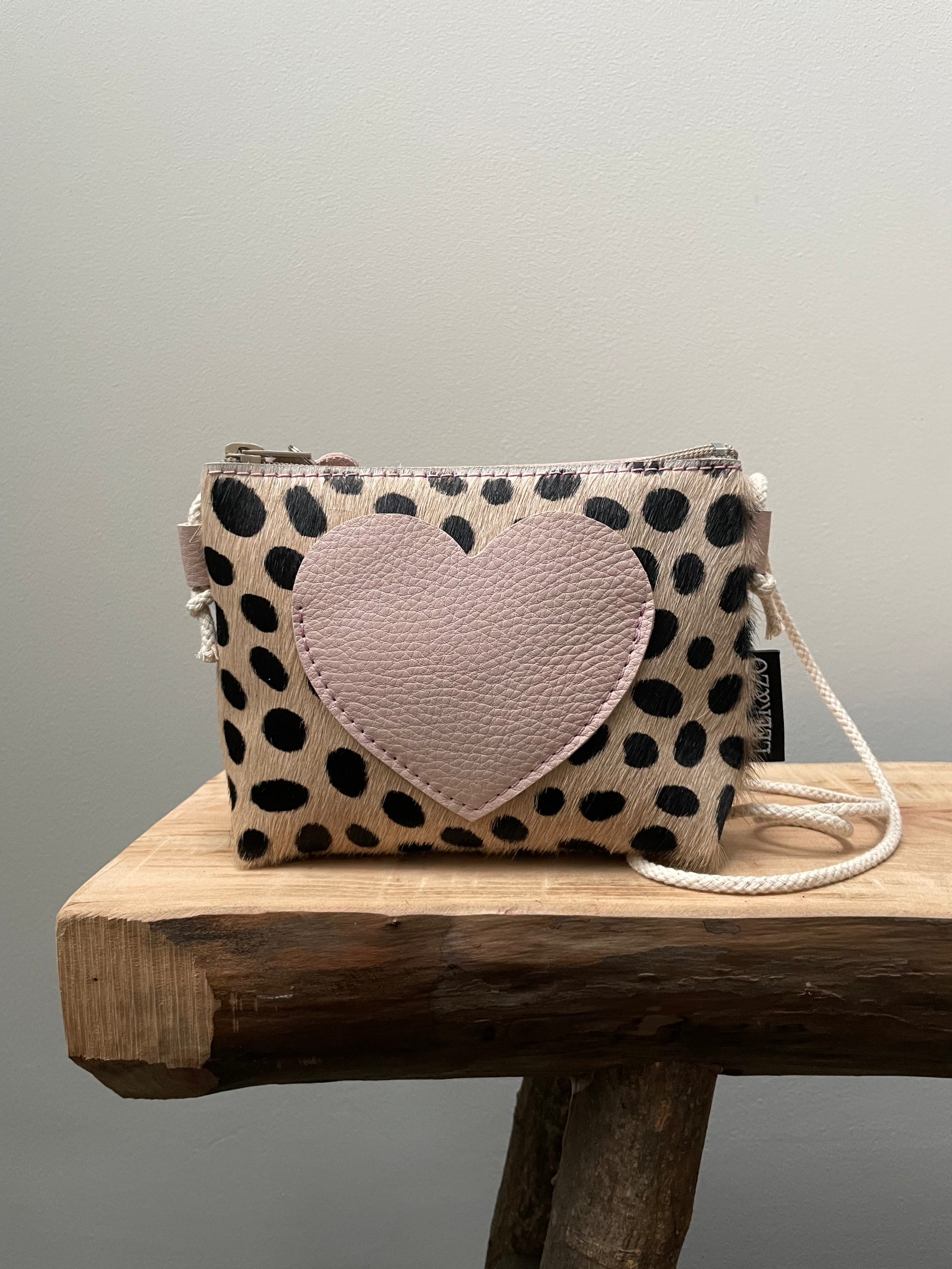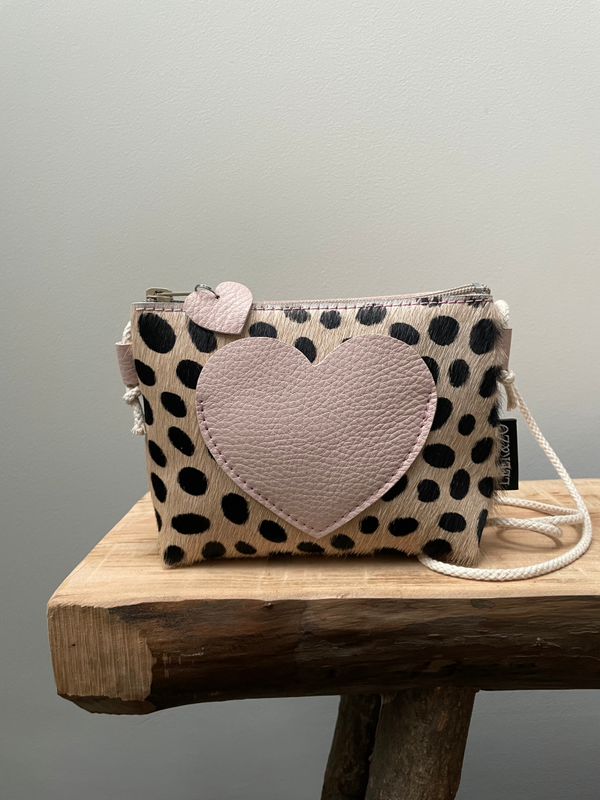 Deze is toch te schattig! Lief klein schoudertasje met op de voorzijde een hartje, wat als vakje gebruikt kan worden. En de achterzijde is van lichtroze leer en sluit aan de bovenzijde met rits.