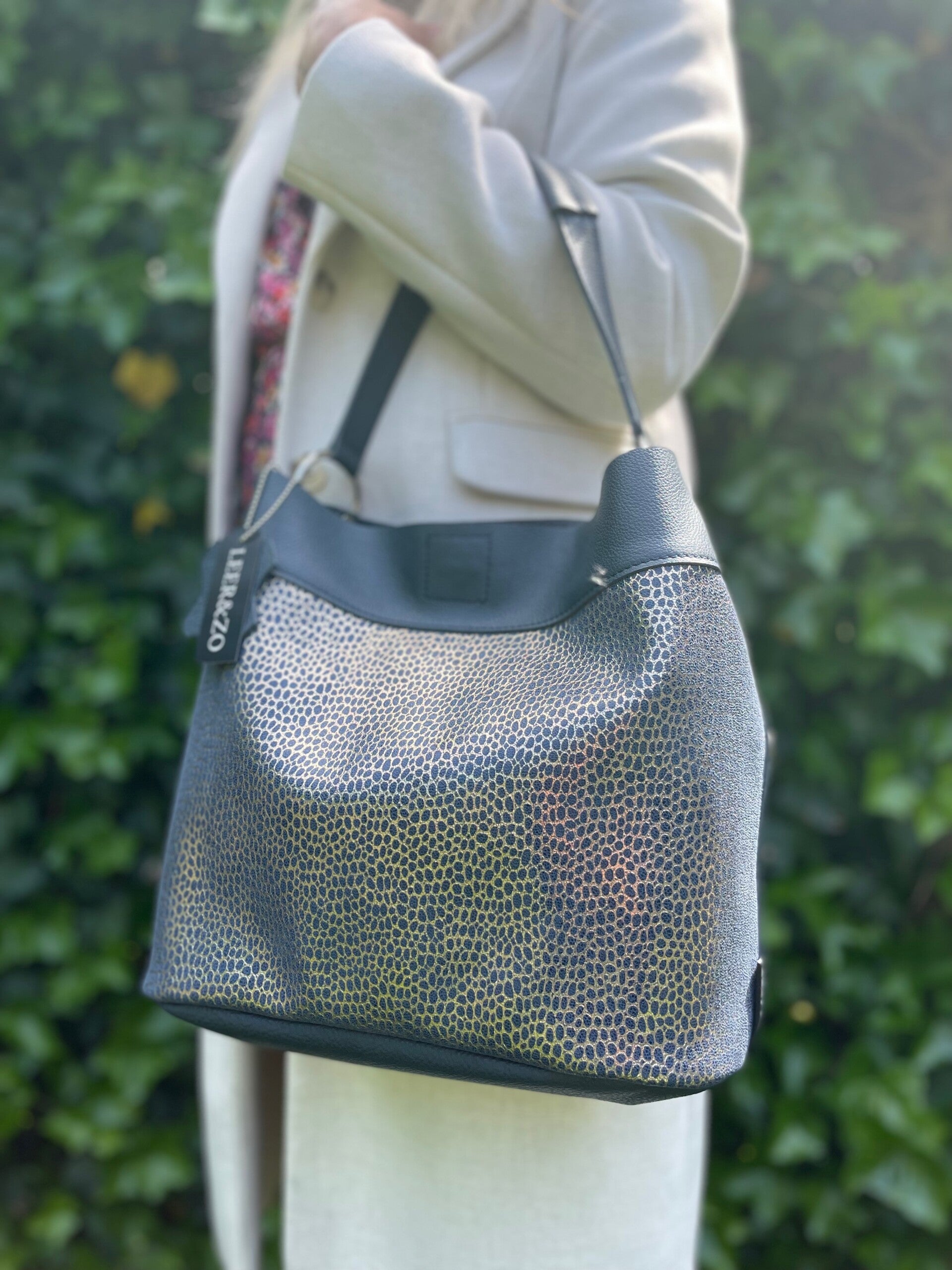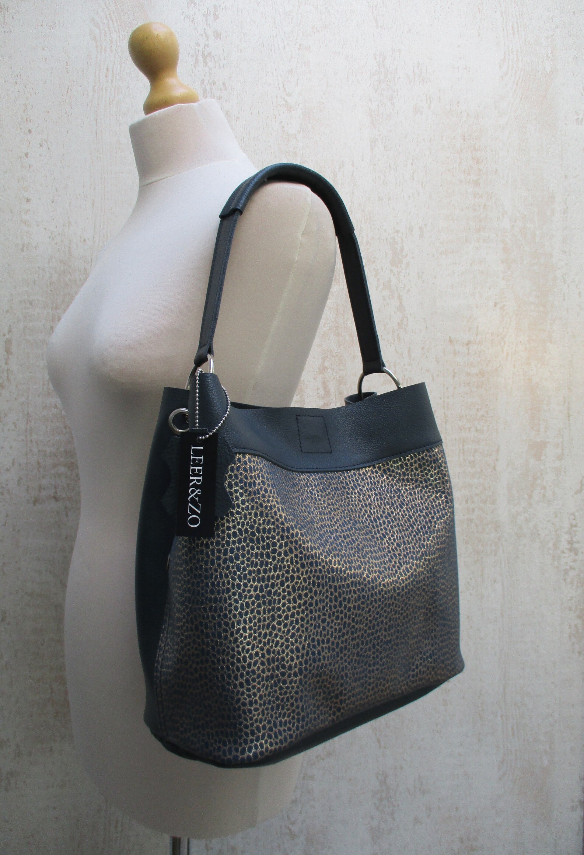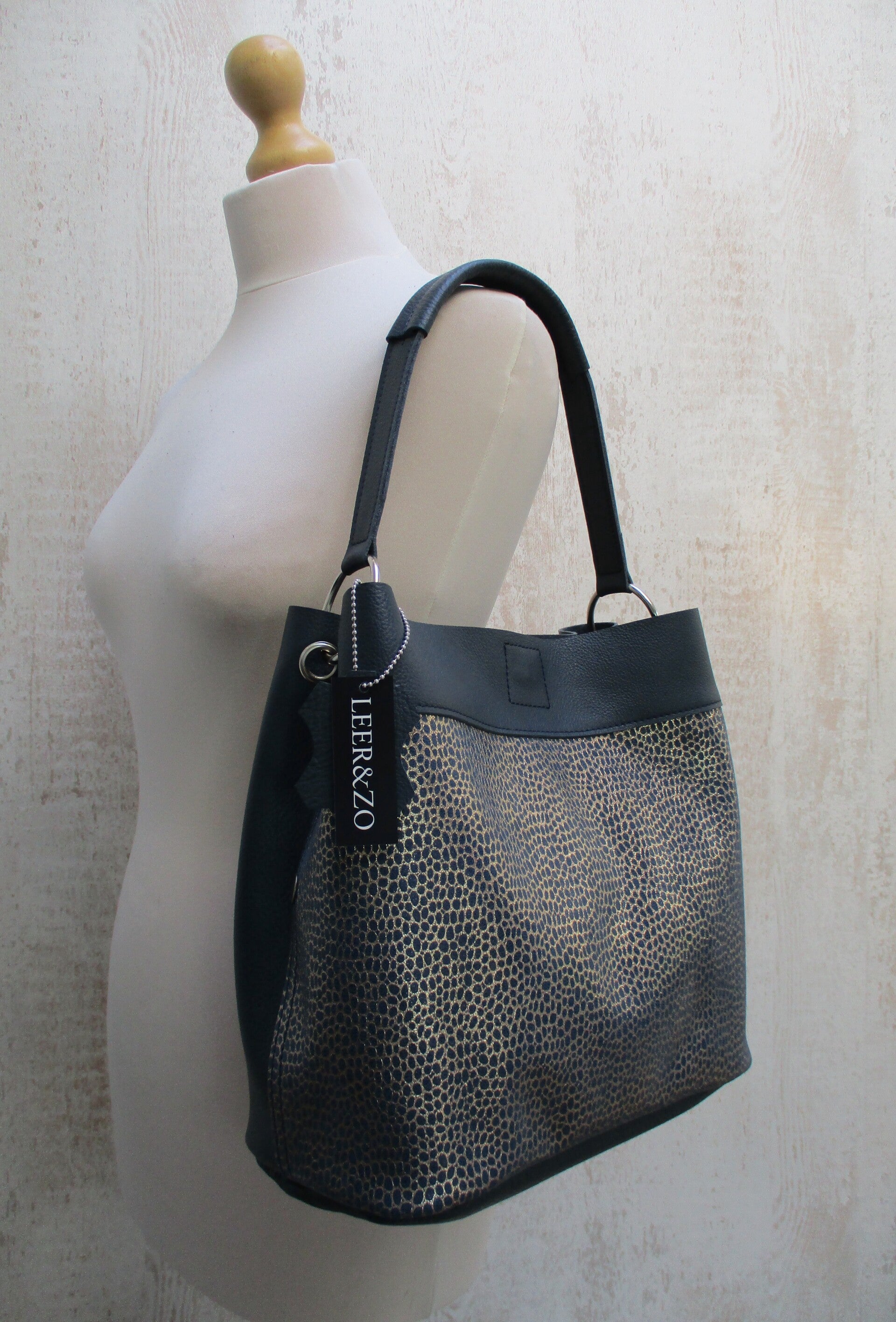 Schitterende buideltas gemaakt van prachtig donkerblauw leer met uniek blauw/goud print op de voorzijde. De tas is zowel aan de hand als over de schouder te dragen. De tas sluit doormiddel van een magneetsluiting aan de bovenzijde. De afmetingen zijn H28 x B30 x D16cm.