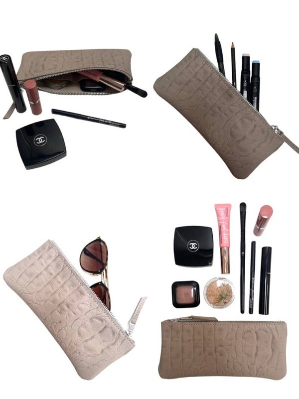 Deze handige leren make-up tas is ideaal om al je make-up netjes en praktisch in mee te nemen. Ruim genoeg voor je mascara, lipgloss en zelfs brede kwasten passen erin. En heeft aan de binnenzijde nog 2 handige vakjes voor bijvoorbeeld oogschaduw. Sluit aan de bovenzijde met stevige YKK rits.