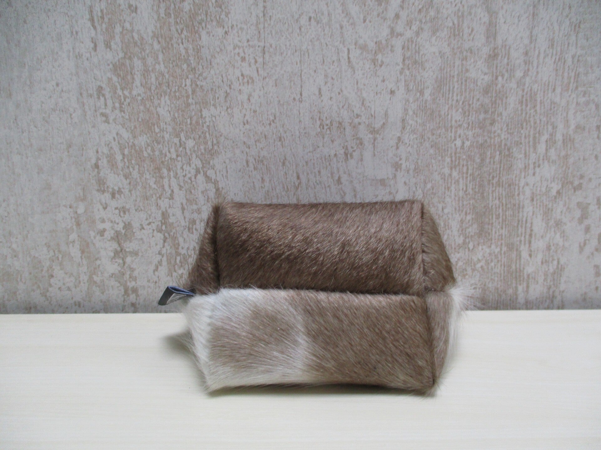 Super handig en stijlvol klein make-up tasje met taupe/wit koeienhuid. Het is een handig rond model waardoor je een goed overzicht hebt op al je make-up spulletjes. Het is een mooi formaat en dus ideaal om mee te nemen in je tas. Aan de bovenzijde voorzien van stevige YKK rits.