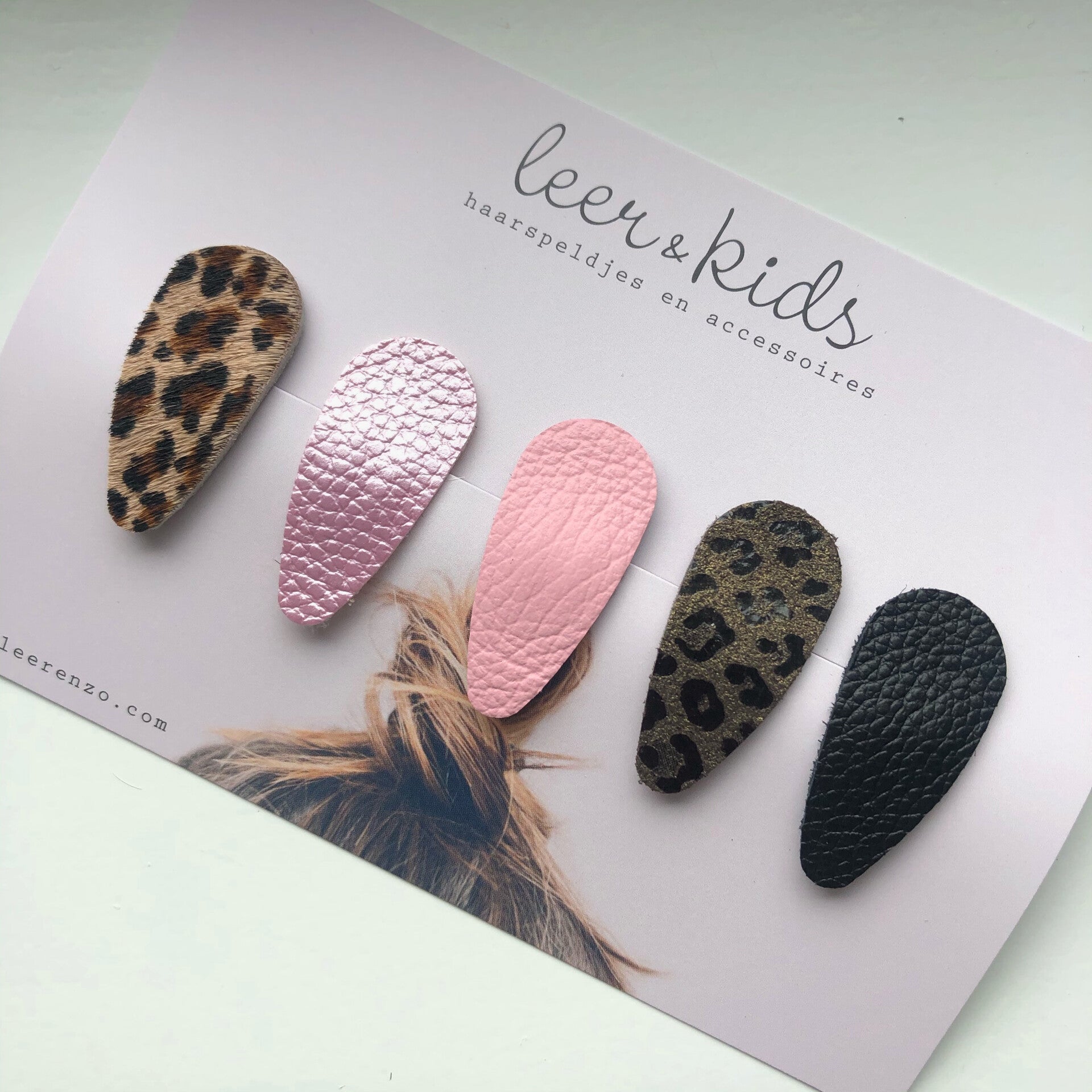Lief setje met 5 verschillende haarspeldjes met de dierenprintjes van dit moment. Dit zijn extra kleine haarspeldjes om de eerste losse haartjes bij elkaar te houden. En leuk om te dragen met een staartje ♡ Maat smal 4 cm.