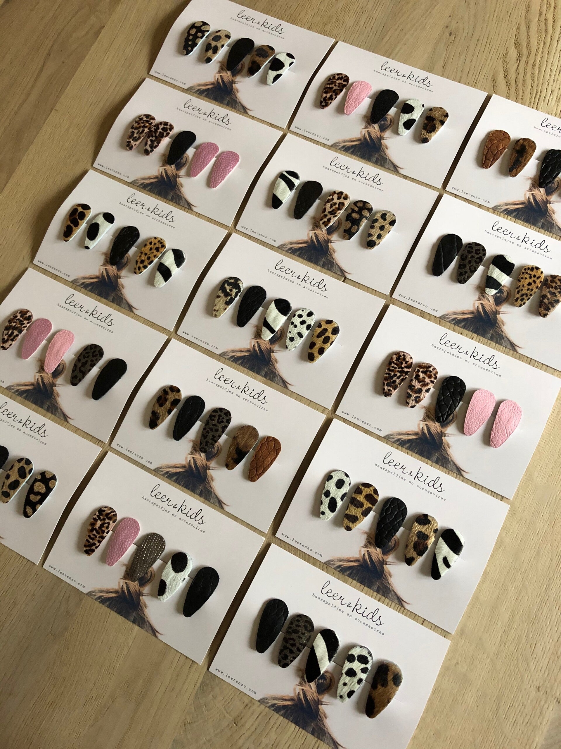 Lief setje met 5 verschillende haarspeldjes met de dierenprintjes van dit moment. Dit zijn extra kleine haarspeldjes om de eerste losse haartjes bij elkaar te houden. En leuk om te dragen met een staartje ♡ Maat smal 4 cm.