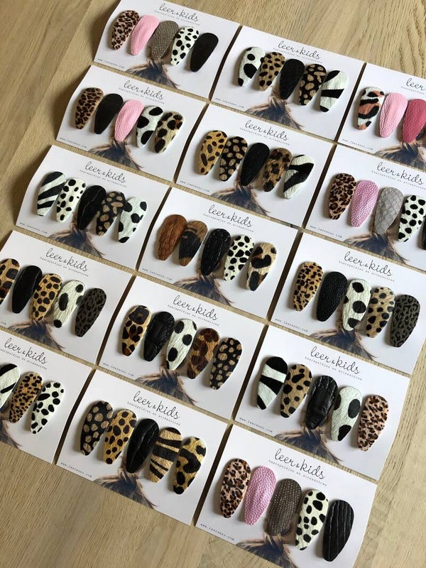 Super lief setje met 5 verschillende haarspeldjes en met de dierenprintjes van dit moment. Leuk te combineren bij elk outfit ♡ Maat large 5,5 cm