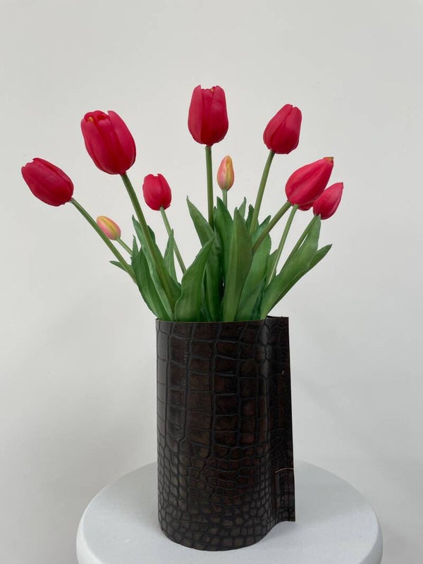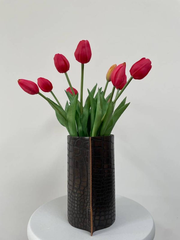 Deze stijlvolle bruine/brons leren vaas met uniek croco print is een aanwinst voor elk interieur. De vaas word geleverd met een waterdichte glazen binnenvaas. En is handgemaakt in eigen atelier. Vul de vaas met kleurrijke (kunst) bloemen. Mocht je de vaas willen schoonmaken, je kan de hoes er vanaf schuiven.