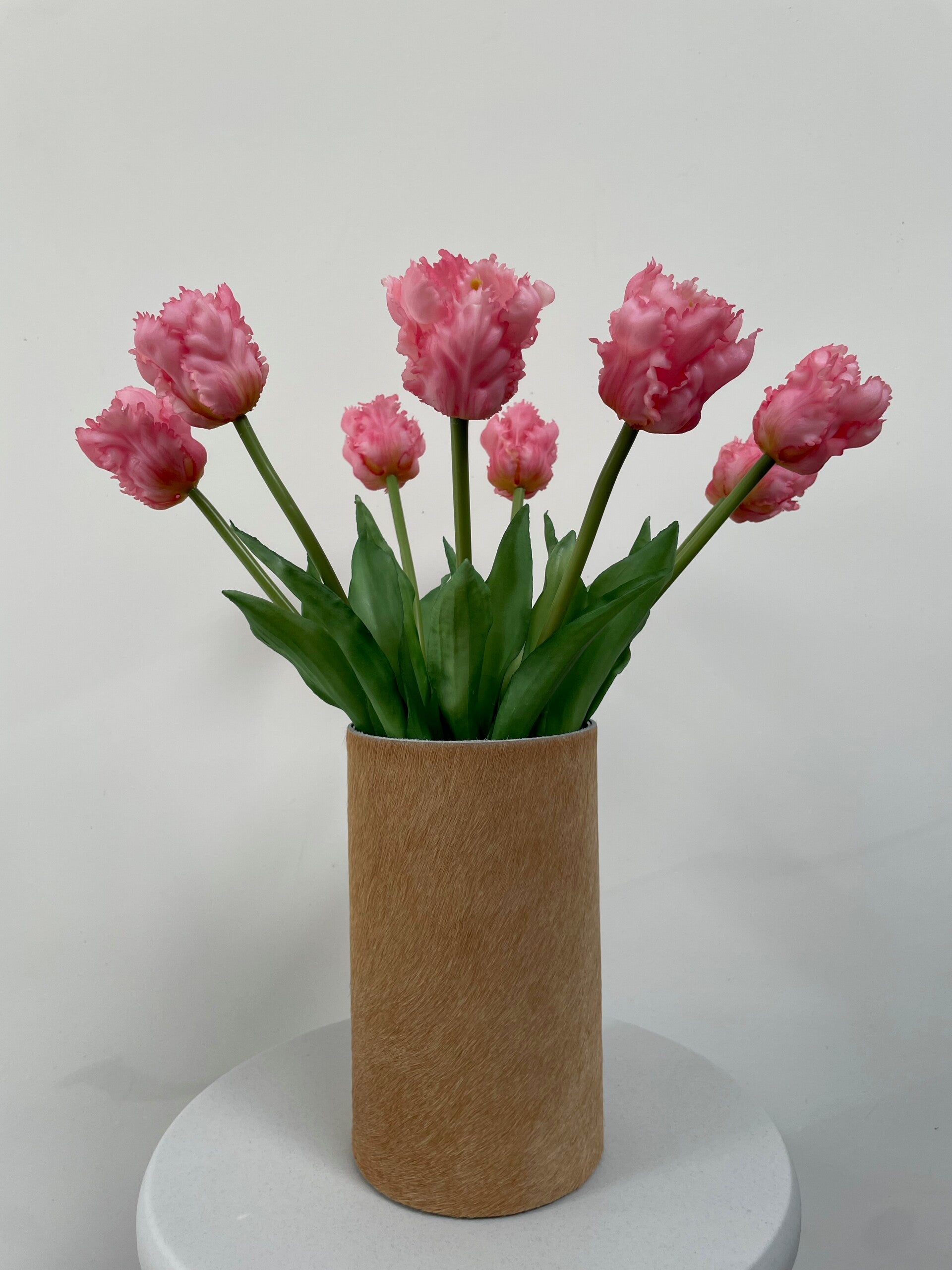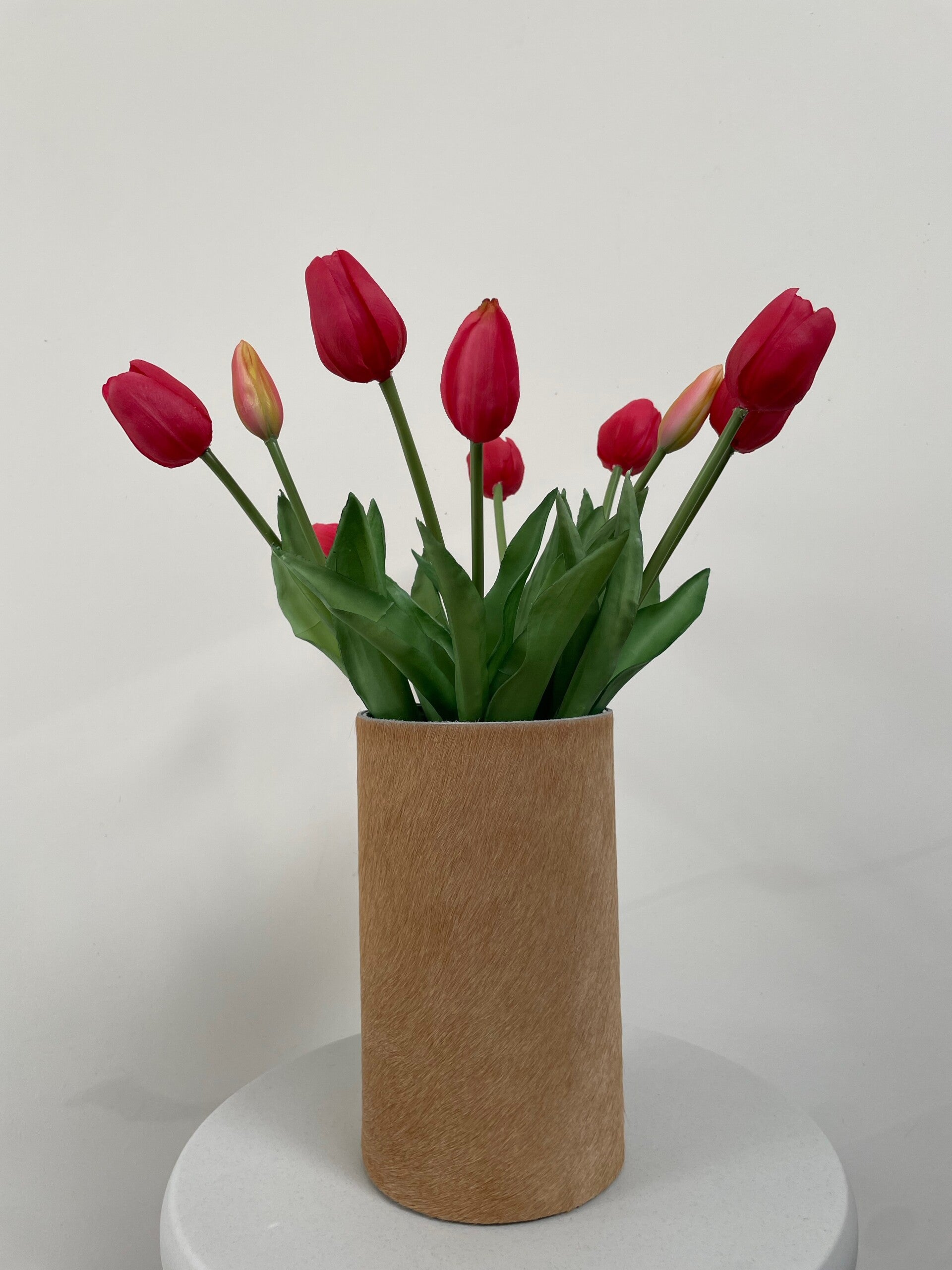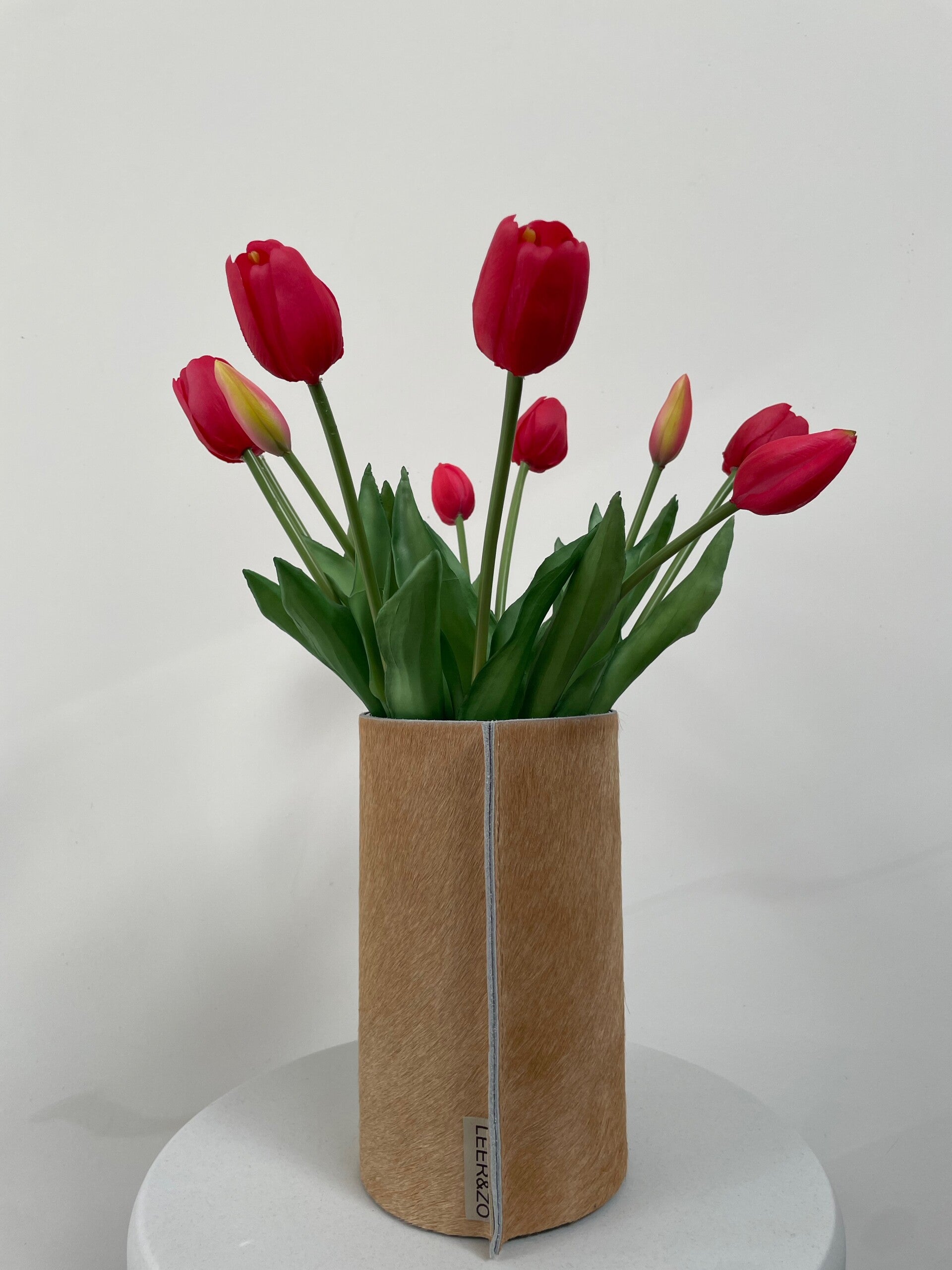 Deze stijlvolle leren vaas met uniek cognac koeienhuid is een aanwinst voor elk interieur. De vaas word geleverd met waterdichte een glazen binnenvaas. En is handgemaakt in eigen atelier. Vul de vaas met kleurrijke (kunst) bloemen. Mocht je de vaas willen schoonmaken, je kan de hoes er vanaf schuiven.