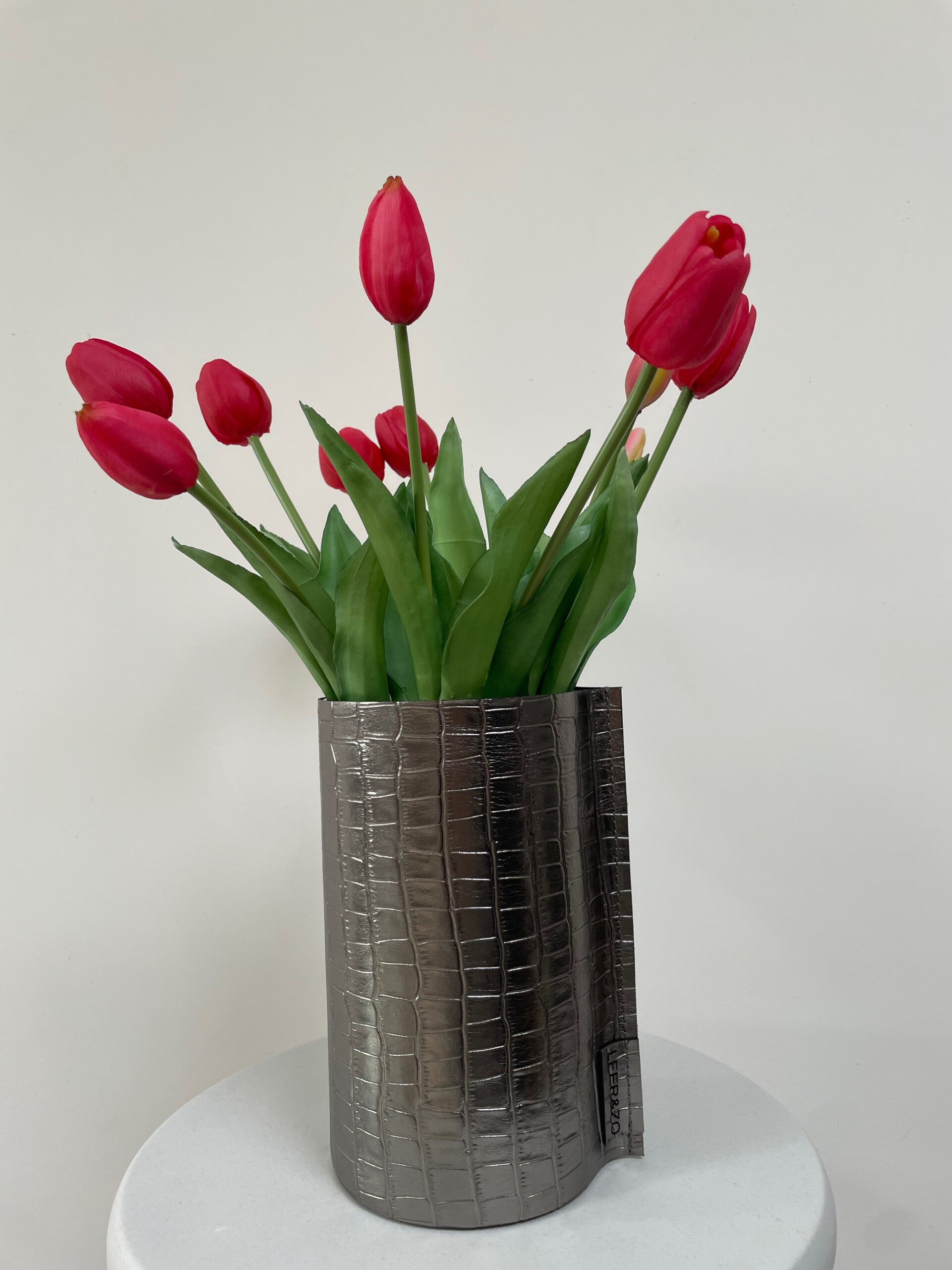 Deze stijlvolle cognac leren vaas met uniek croco print is een aanwinst voor elk interieur. De vaas word geleverd met een waterdichte glazen binnenvaas. En is handgemaakt in eigen atelier. Vul de vaas met kleurrijke (kunst) bloemen. Mocht je de vaas willen schoonmaken, je kan de hoes er vanaf schuiven.