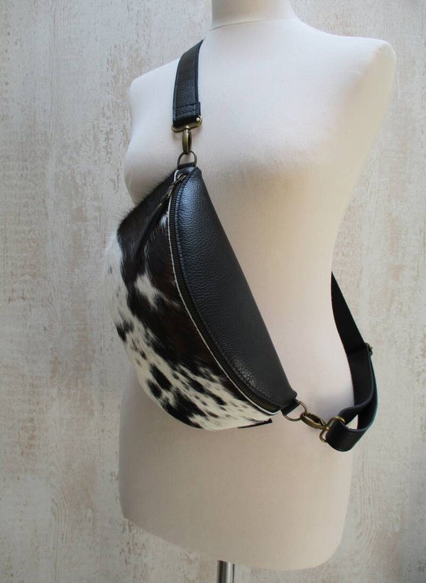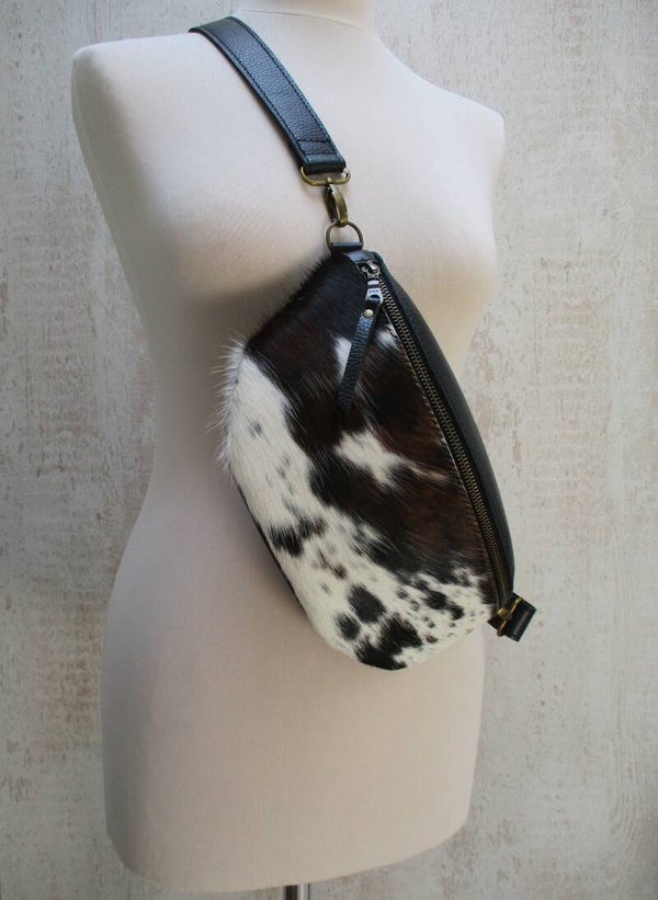 Zwart leren fanny pack / heuptas tricolor koeienhuid