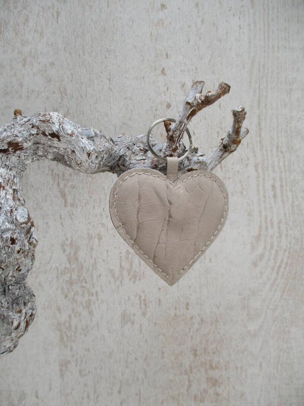Super schattige leren sleutelhanger. De sleutelhanger is gemaakt van mooi taupe koeienhuid, en voorzien van taupe croco leer op de achterzijde. De sleutelhanger is verstevigd aan de binnenzijde. Leuk voor aan je sleutelbos of tas.