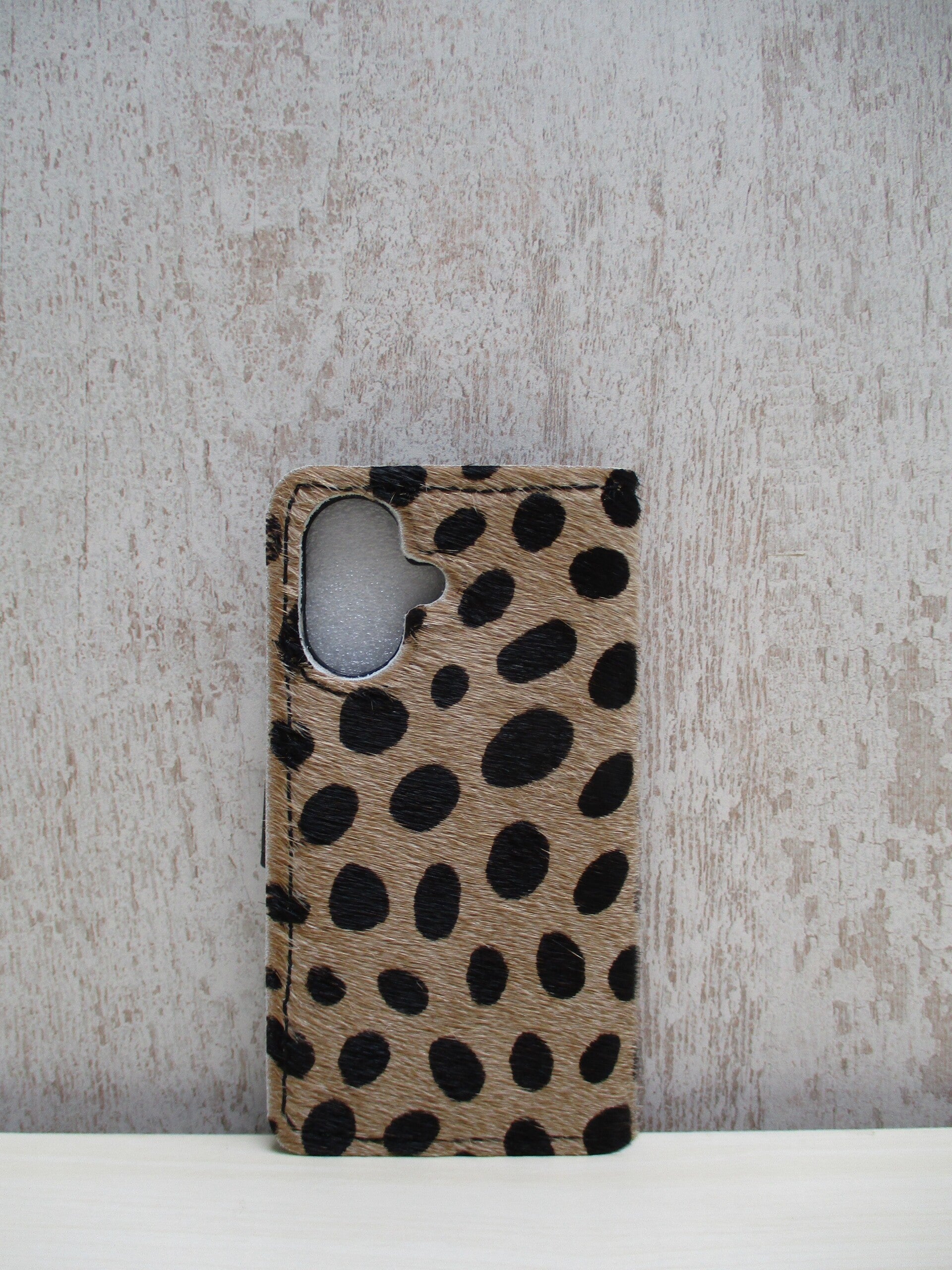Prachtige leren Book-cases geschikt voor de iPhone 16. En voorzien van mooi dalmatier/beige koeienhuid. Aan de binnenzijde is er ruimte voor 3 pasjes. En voorzien van een onbreekbare siliconen houder. Sluit doormiddel van een magneetsluiting.
