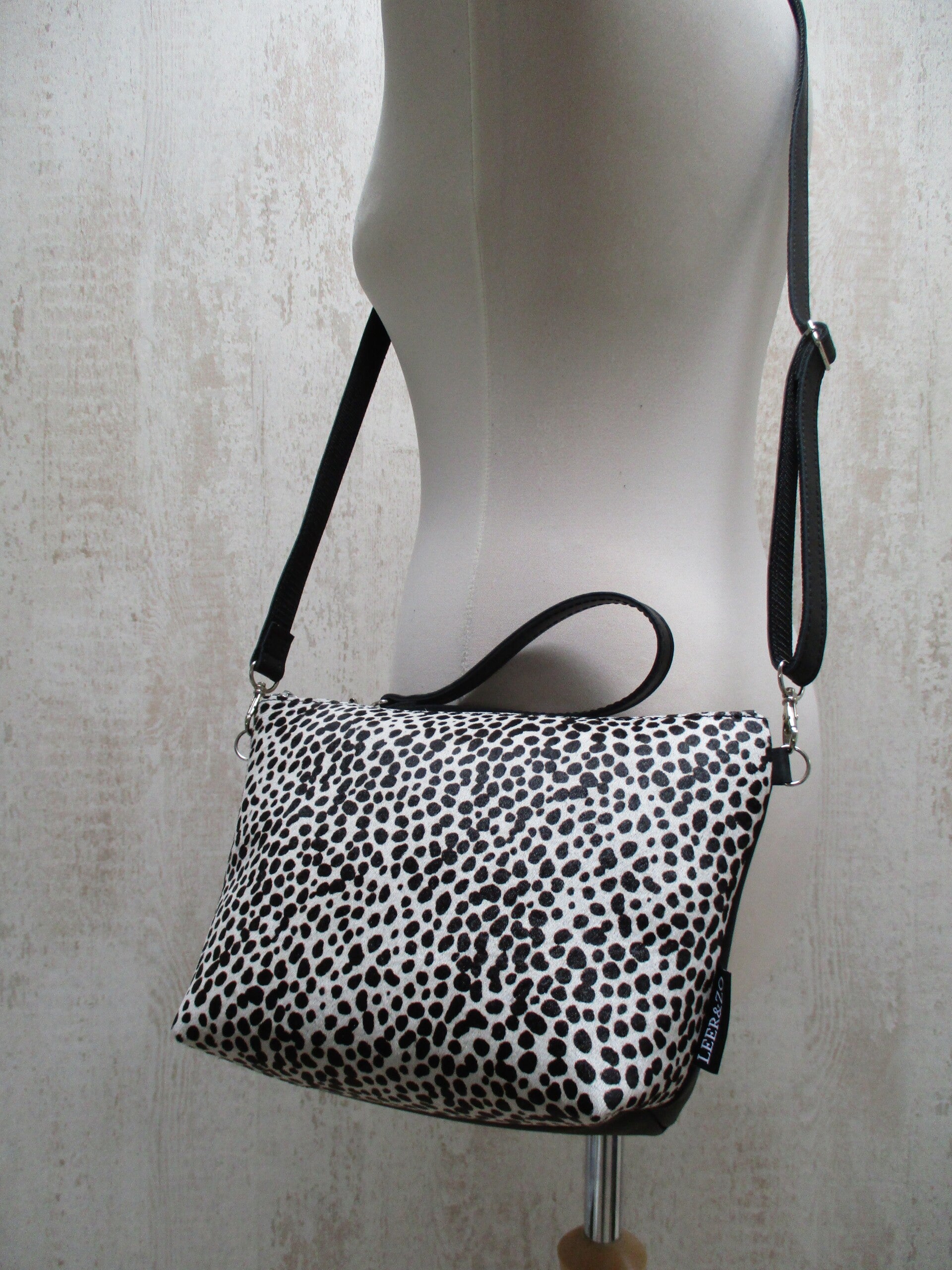 Schitterende schoudertas en clutch in één. De schoudertas is te gebruiken als handig schoudertas en als stoere grote clutch. De tas is gemaakt van sublieme kwaliteit dots print koeienhuid. En de achterzijde is van zwart leer. De schouderband is verstelbaar en voorzien van clips en makkelijk los te halen. Aan de bovenzijde voorzien van een mooie stevige YKK rits.