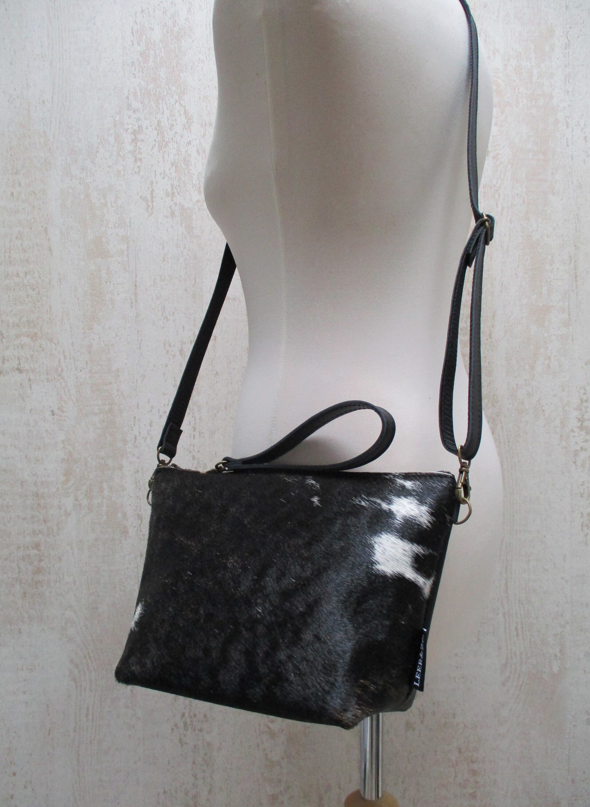Schitterend handgemaakt ruime leren schoudertas en clutch in één. Het tas is te gebruiken als handig schoudertas en als stoere grote clutch. De voorzijde is van sublieme kwaliteit zwart/wit koeienhuid en de achterzijde van mooi zwart leer. Schouderband is verstelbaar en voorzien van clips en makkelijk los te halen. Aan de bovenzijde voorzien van een stevige YKK rits.