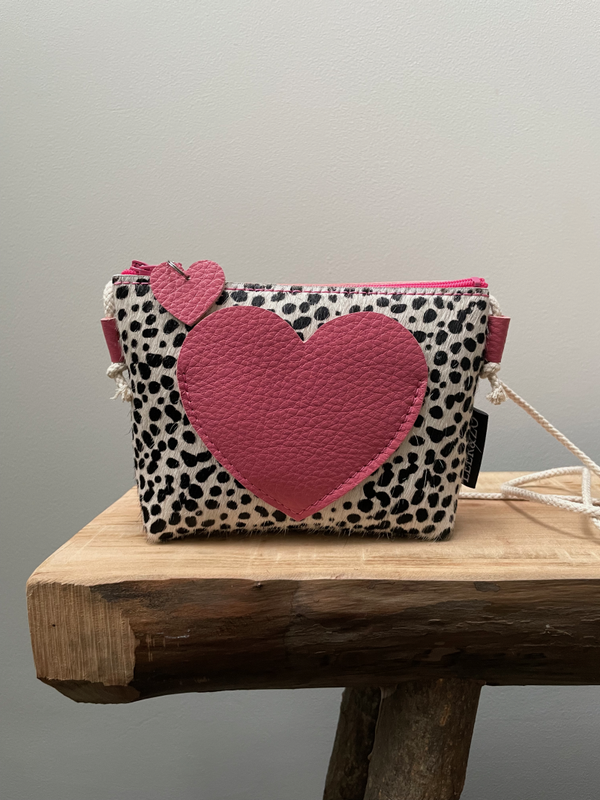 Deze is toch te schattig! Lief klein schoudertasje met op de voorzijde een hartje, wat als vakje gebruikt kan worden. En de achterzijde is van zwart leer en sluit aan de bovenzijde met rits.
