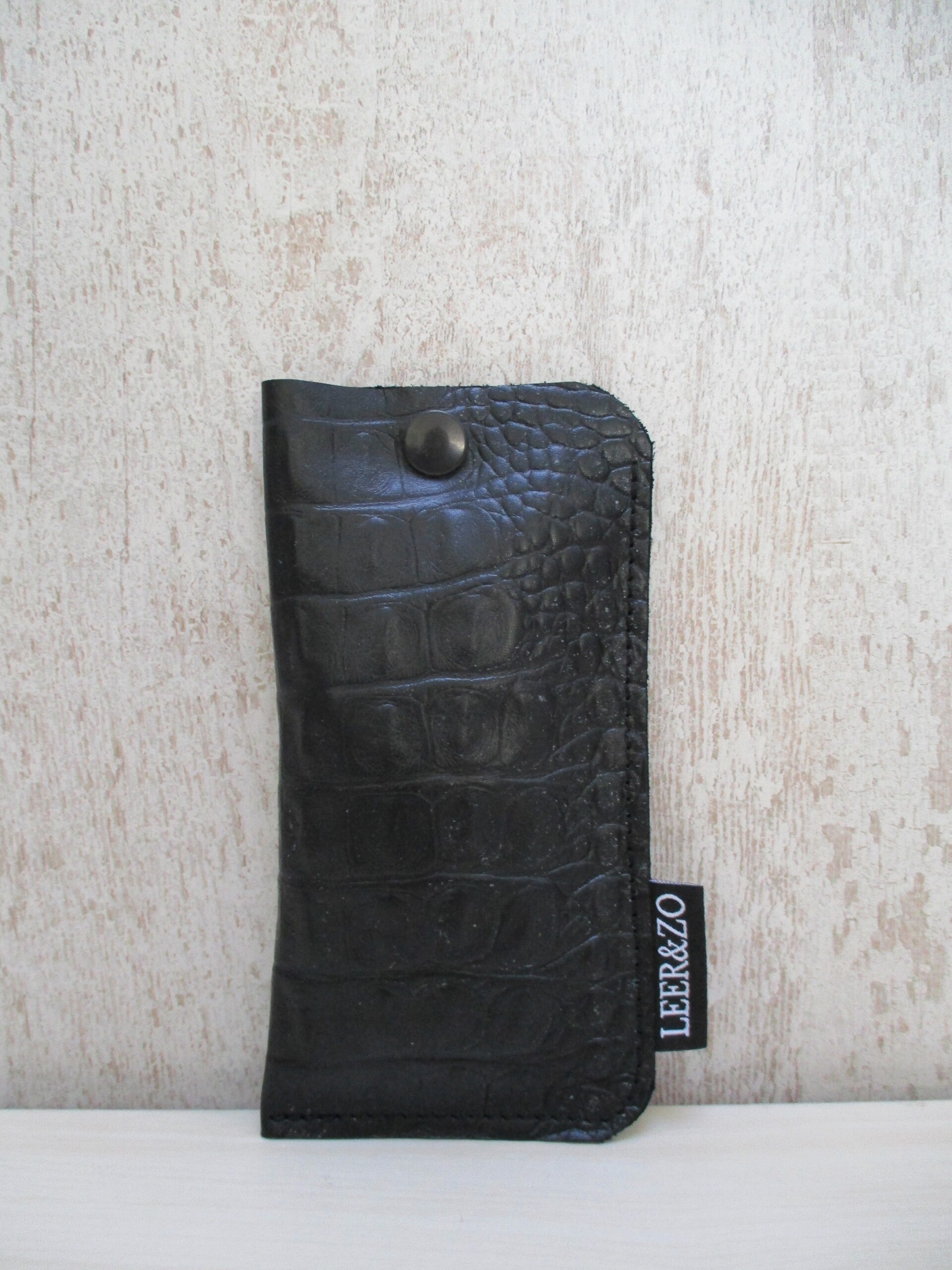 Bescherm je bril of zonnebril in deze stijlvolle leren brillenhoes, gemaakt van prachtig zwart leer met croco print. In deze brillenhoes is je bril netjes en veilig beschermd tegen vallen, stoten en krassen. Sluit doormiddel van een drukknoop aan de bovenzijde.