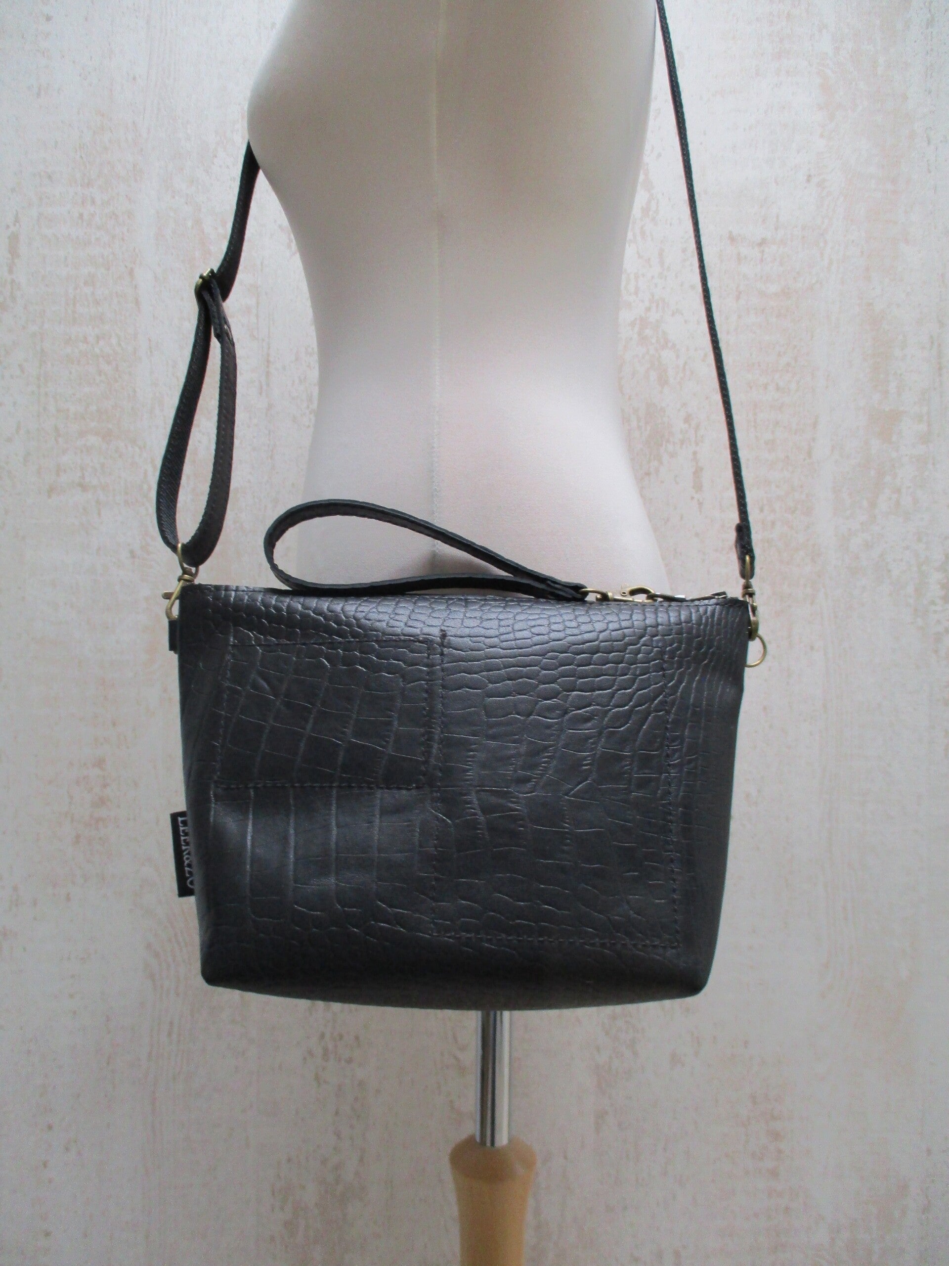 Schitterend schoudertas en clutch in één en te gebruiken als handig schoudertas en als stoere grote clutch. De tas is gemaakt van sublieme kwaliteit zwart leer met croco print. Schouderband is verstelbaar en voorzien van clips en makkelijk los te halen. Aan de bovenzijde voorzien van een mooie stevige YKK rits.