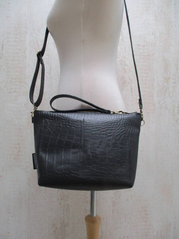 Zwart leren schoudertas met crocodille print
