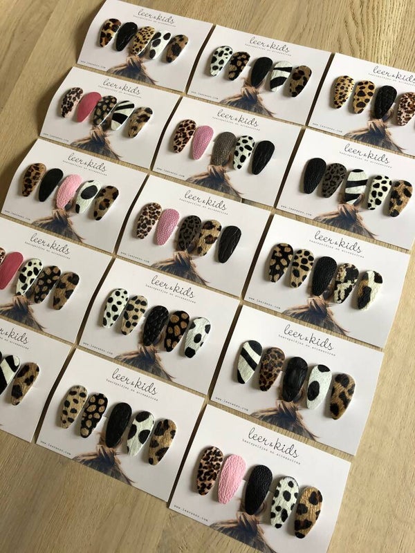 Super lief setje met 5 verschillende haarspeldjes en met de dierenprintjes van dit moment. Leuk te combineren bij elk outfit ♡ Maat medium 4,5 cm