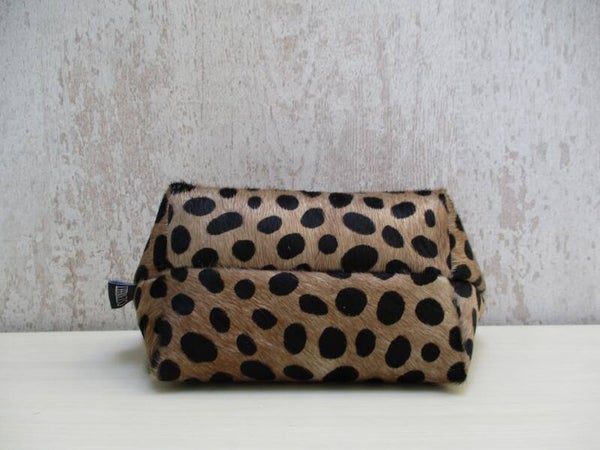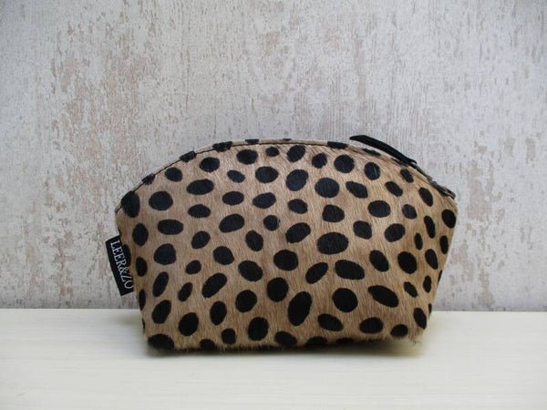 Schitterende handgemaakte make-up tas van sublieme kwaliteit koeienhuid met dalmatier print. Het is een handig rond model waardoor je een goed overzicht hebt op al je make-up spulletjes. En ideaal om mee te nemen in je handtas. Door de brede bodem is de make-up tas lekker ruim, en aan de bovenzijde voorzien van stevige YKK rits.