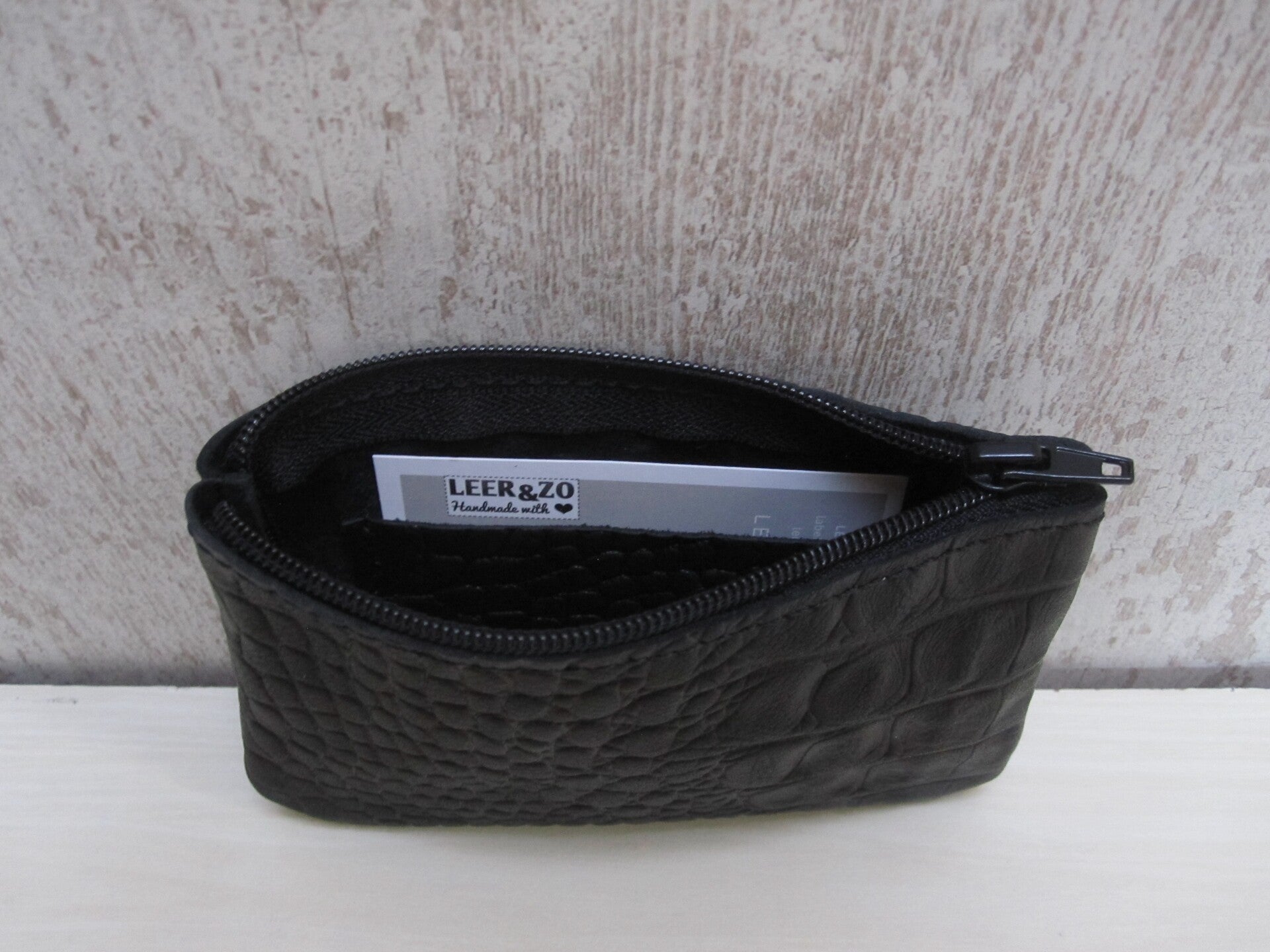 Handzaam en multifunctioneel zwart leren etui met croco print. Te gebruiken voor het opbergen van bankpassen, visitekaartjes, geld, sleutel etc. Handig voor in je tas om al je spulletjes netjes bij elkaar te houden. Aan de binnenzijde voorzien van een creditcard vakje. Afsluitbaar doormiddel van een rits.