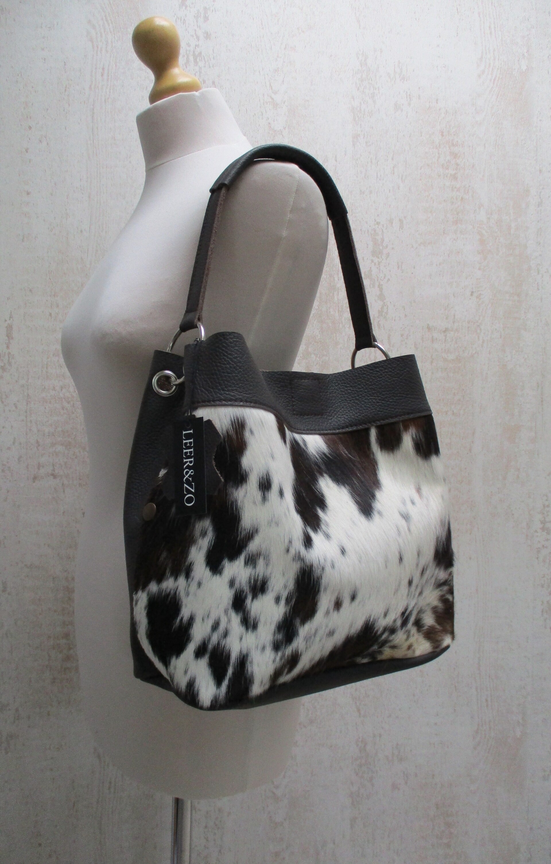 Schitterende buideltas gemaakt van prachtig tricolor koeienhuid. De achterzijde is van mooi donkerbruin leer. De tas is zowel aan de hand als over de schouder te dragen. En sluit doormiddel van een magneetsluiting aan de bovenzijde. De afmetingen zijn H28 x B30 x D16cm.