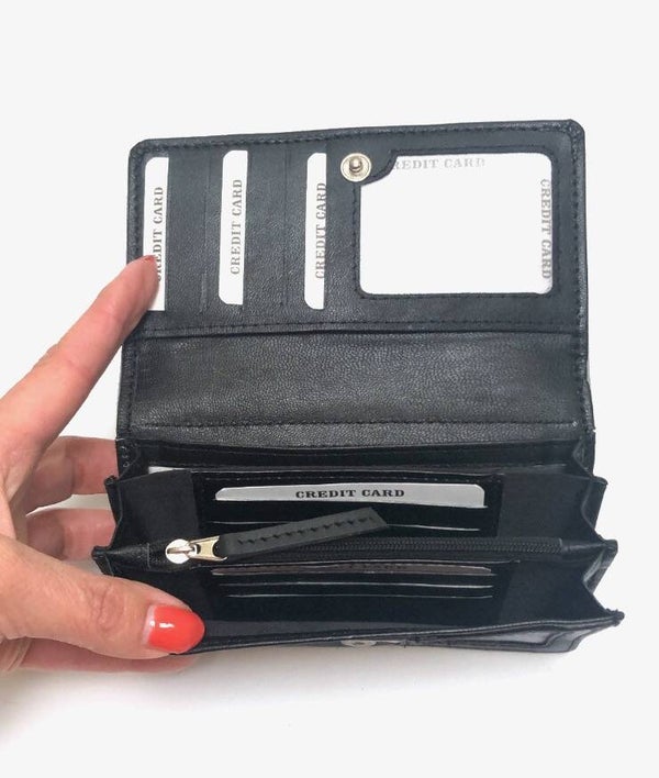 Intern is er ruimte voor minimaal 13 pasjes, een doorzichtig slide-in vak, 3 ruime briefgeldvakken en een ritsvak voor kleingeld. Op de achterzijde zit nog een extra ritsvak.