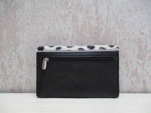 Handig compact overslagportemonnee met koeienhuid dalmatiër print. Het is een iets smaller model, maar voorzien van extra vak. En daarom is deze portemonnee uitermate geschikt voor de wat kleinere tasjes.