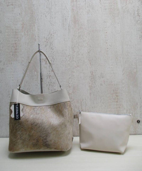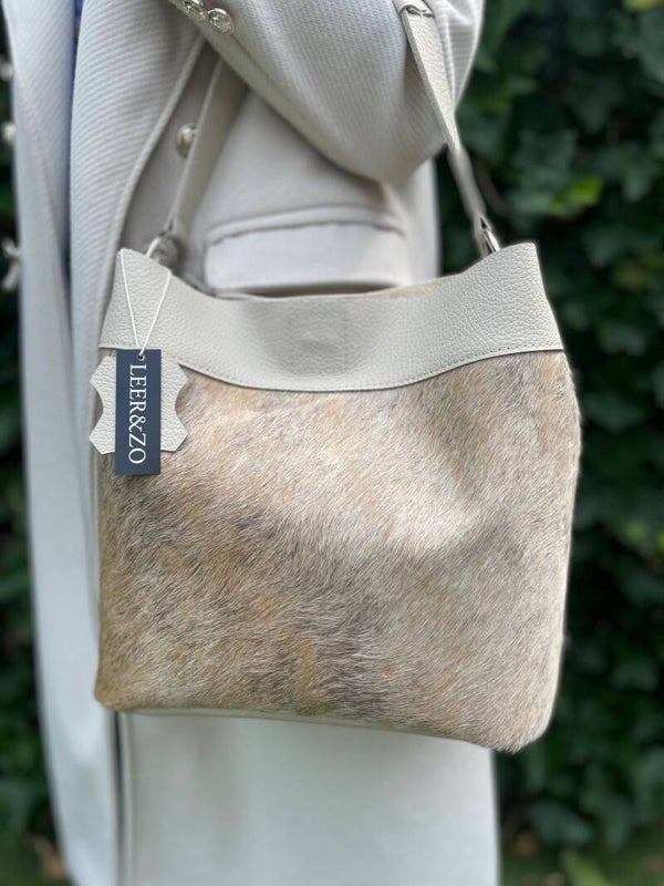 Schitterende beige leren buideltas gemaakt van prachtig beige/grijs koeienhuid. De achterzijde is van mooi beige leer. De tas is zowel aan de hand als over de schouder te dragen. En sluit doormiddel van een magneetsluiting aan de bovenzijde. De afmetingen zijn H28 x B30 x D16cm.