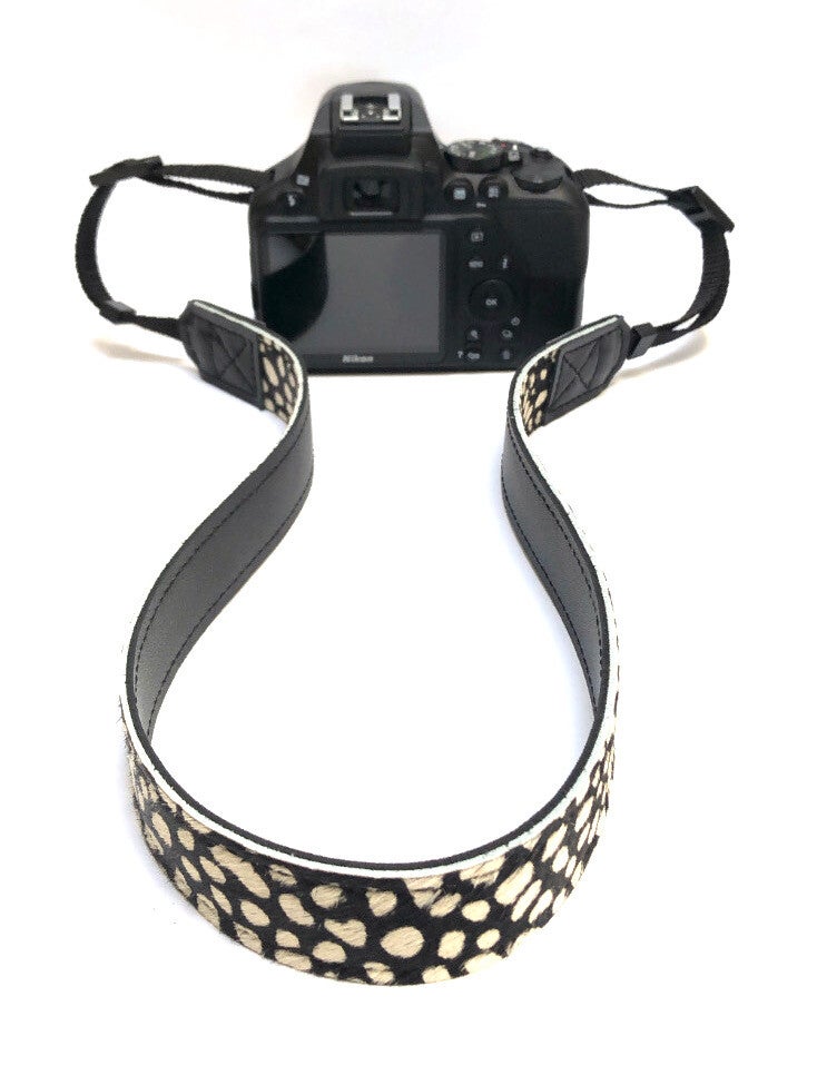 Ga stijlvol op pad met deze stoere camerariem. De camerariem is gemaakt van koeienhuid met cheetah print. Aan de onderzijde voorzien van zacht soepel zwart leer. De strap wordt geleverd met universele verstelbare gespen, zodat die voor vrijwel geschikt is voor de meeste camera merken (DLSR / Nikon/ Canon / Sony) De breedte van de bevestiging aan de camera is 1 cm.