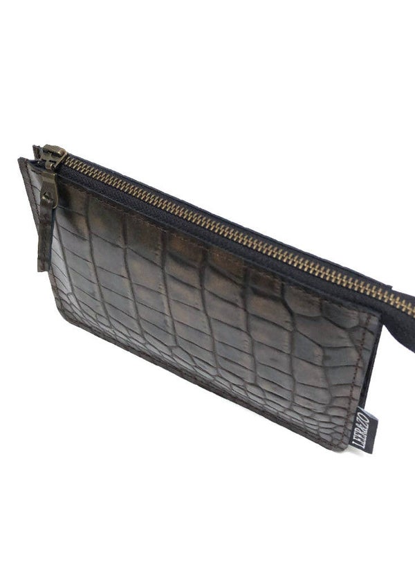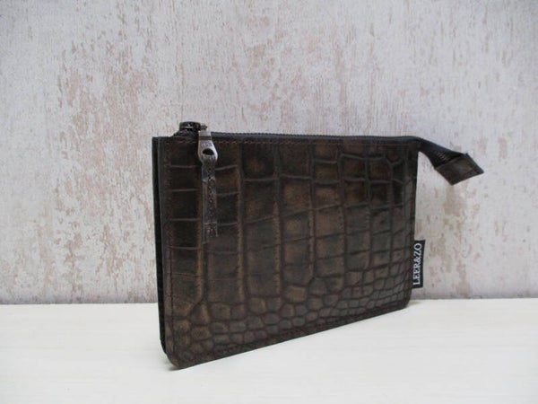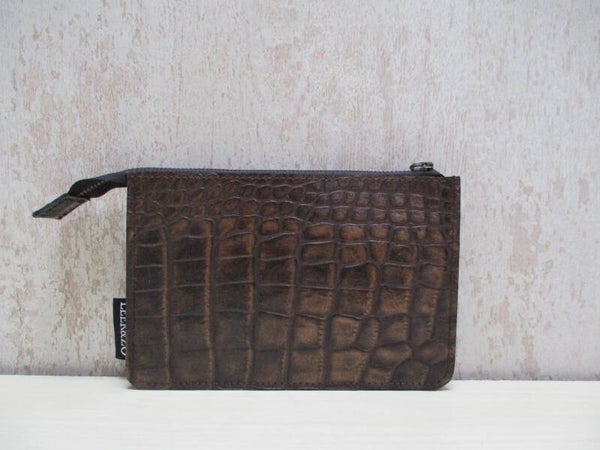 Super handzaam en multifunctioneel portemonneetje, gemaakt van mooi donkerbruin/brons leer met croco print. Aan de binnenzijde voorzien van 2 grote vakken en klein vakje en 3 creditcardvakjes. Te gebruiken voor het opbergen van bankpassen, visitekaartjes, geld, etc. Handig voor in je tas om al je spulletjes netjes bij elkaar te houden. Afsluitbaar doormiddel van een rits.