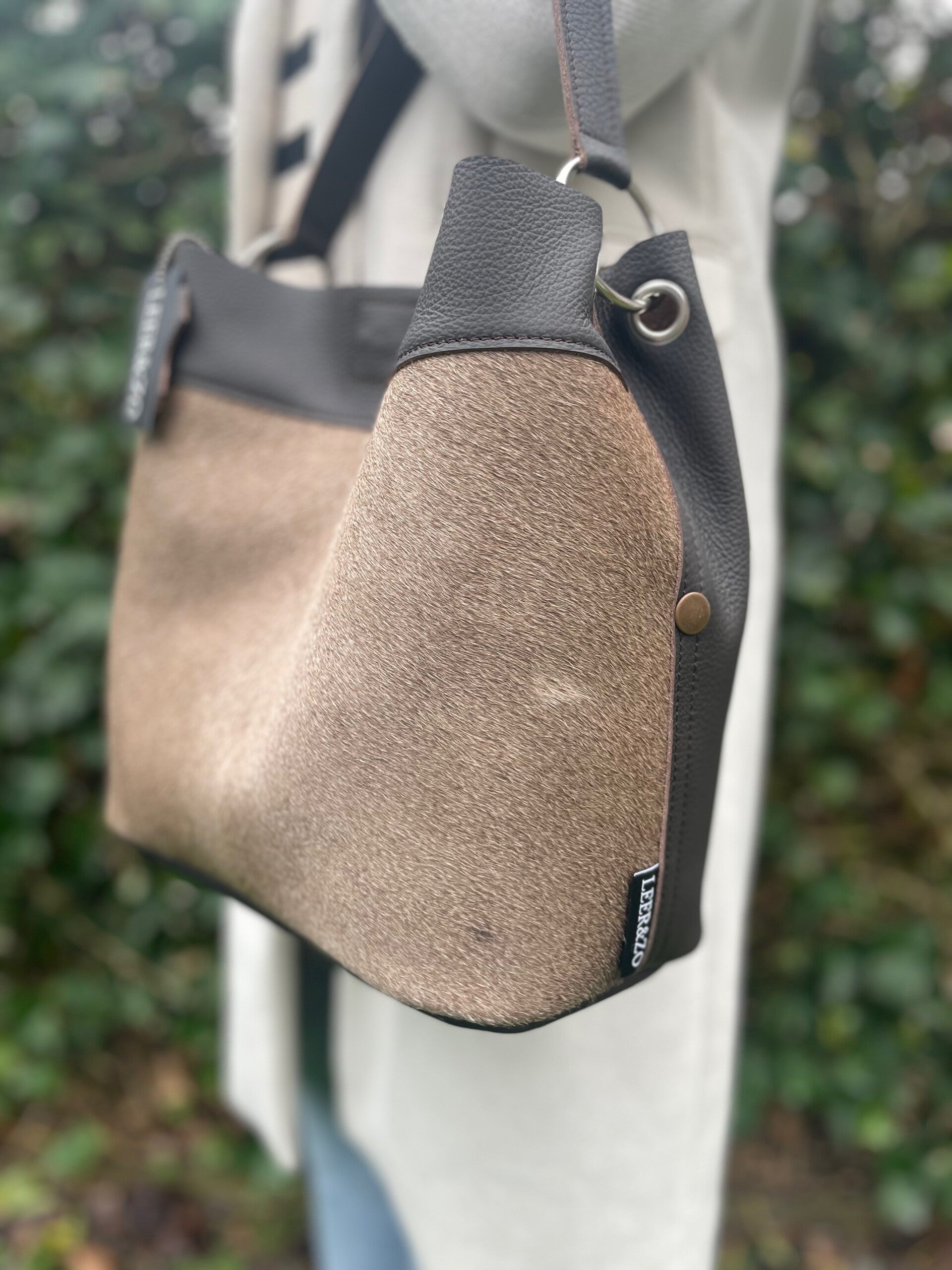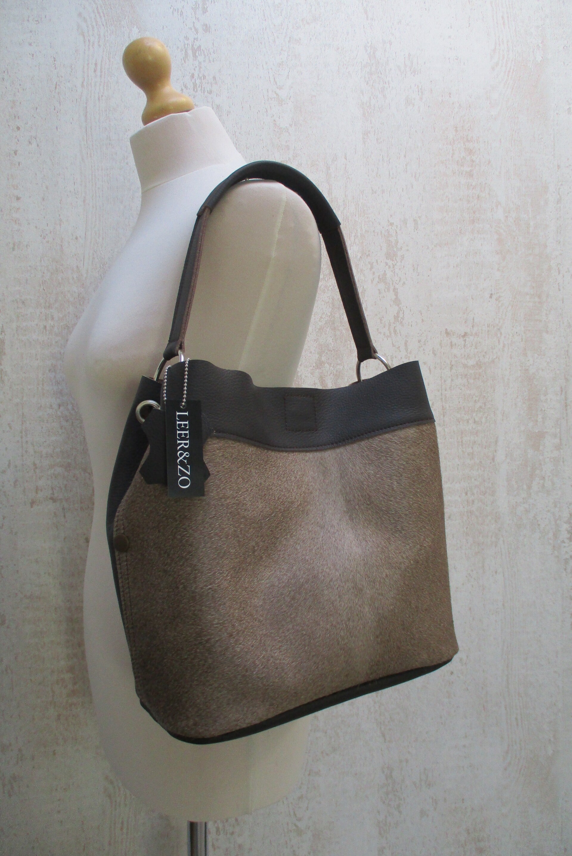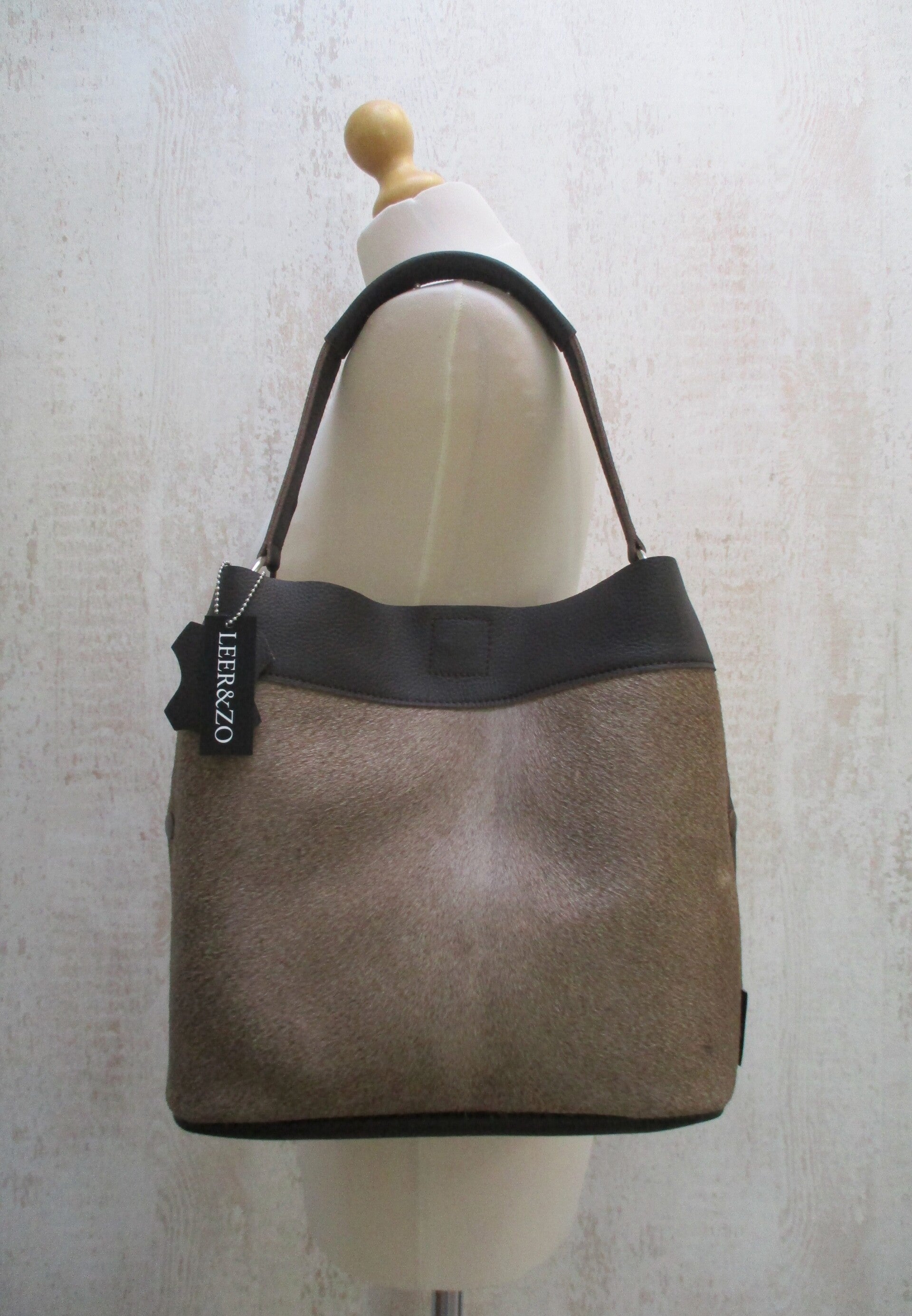 Schitterende buideltas gemaakt van sublieme kwaliteit taupe koeienhuid. De achterzijde is van mooi donkerbruin leer. De tas is zowel aan de hand als over de schouder te dragen. En sluit doormiddel van een magneetsluiting aan de bovenzijde. De afmetingen zijn H28 x B30 x D16cm.
