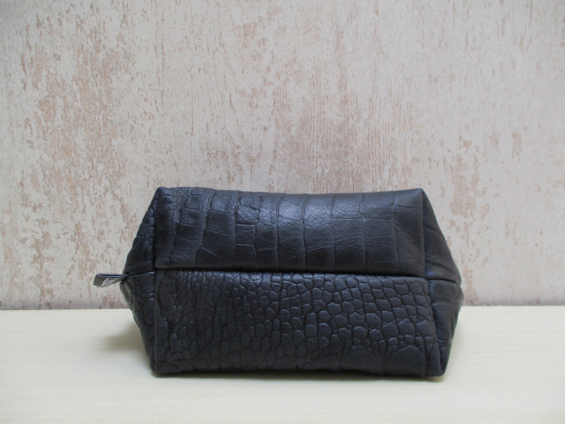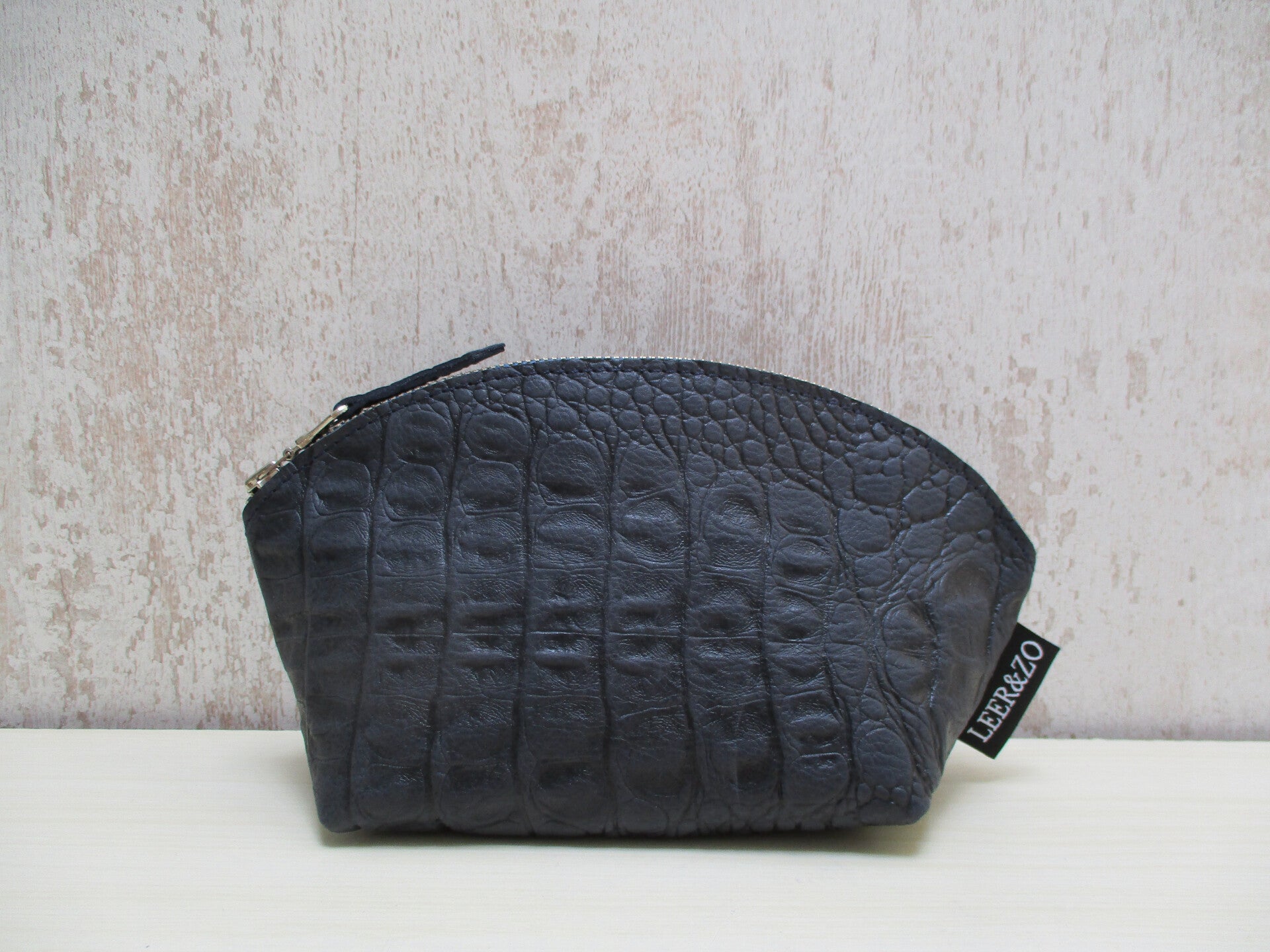 Schitterende handgemaakte make-up tas van sublieme kwaliteit zwart leer met croco print. Het is een handig rond model waardoor je een goed overzicht hebt op al je make-up spulletjes. En ideaal om mee te nemen in je handtas. Door de brede bodem is de make-up tas lekker ruim, en aan de bovenzijde voorzien van stevige YKK rits.