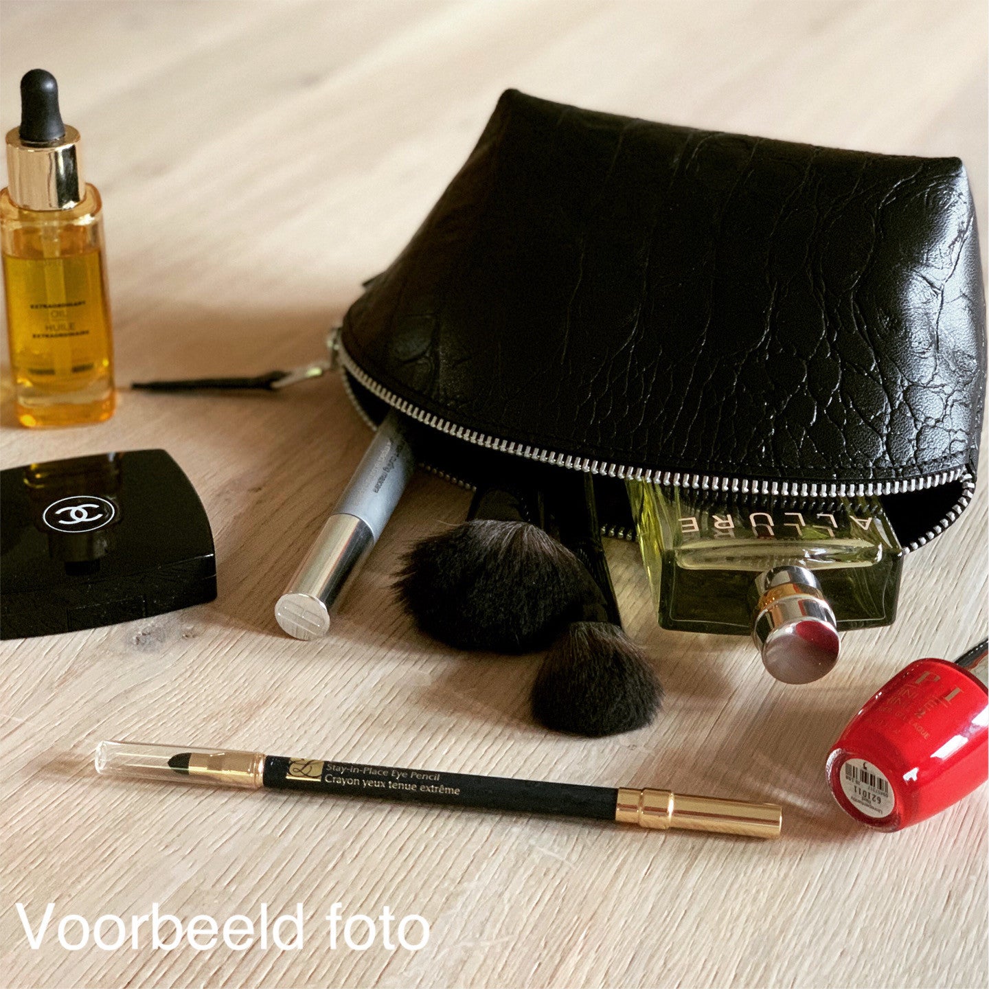 Schitterende handgemaakte zwart leren make-up tas met croco print. Het is een handig rond model waardoor je een goed overzicht hebt op al je make-up spulletjes. En ideaal om mee te nemen in je handtas. Door de brede bodem is de make-up tas lekker ruim, en aan de bovenzijde voorzien van stevige YKK rits.