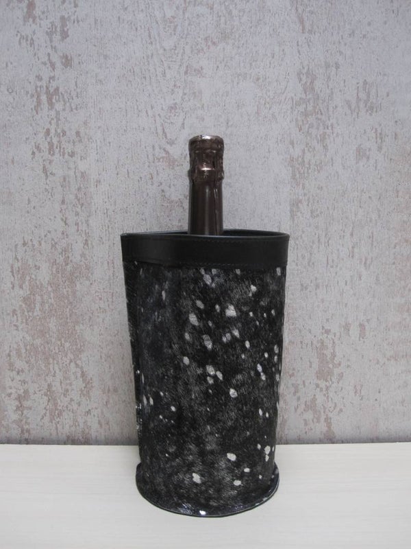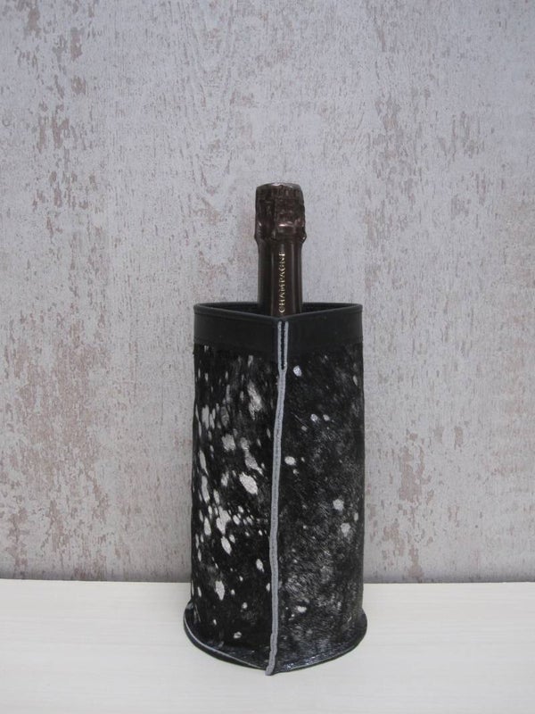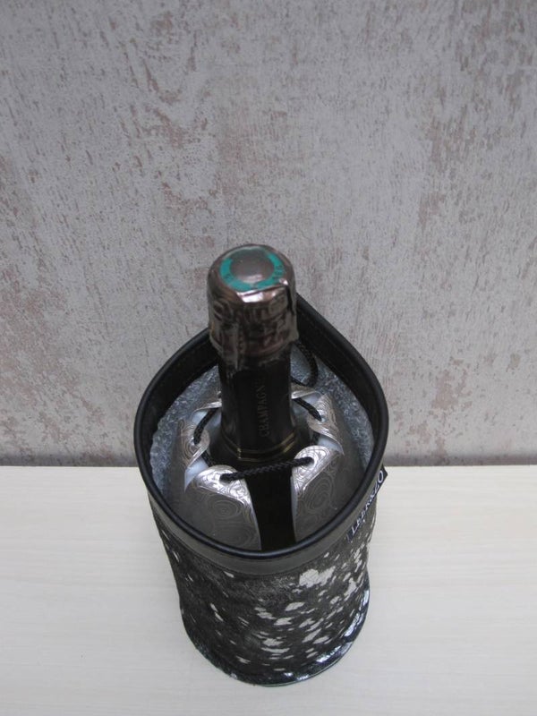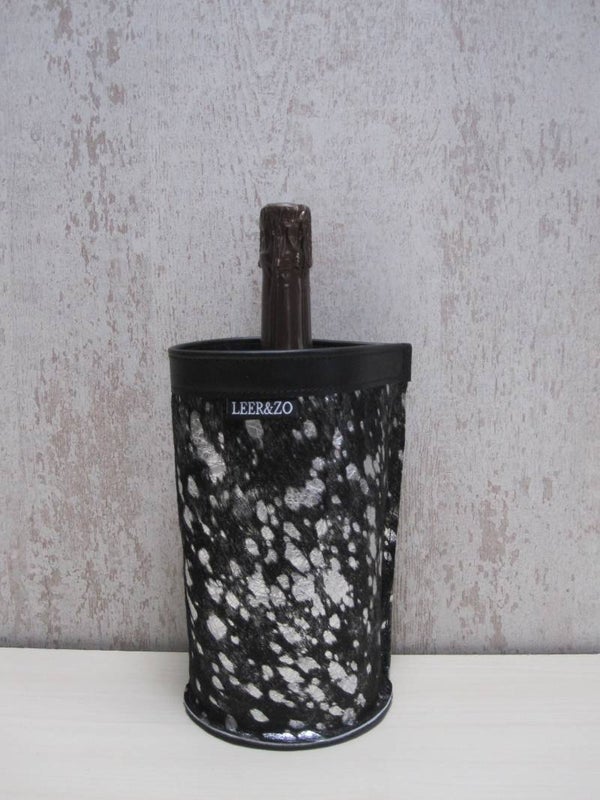Stijlvolle en originele champagne koeler gemaakt van een sublieme kwaliteit zwart koeienhuid, met unieke metallic zilveren vlekken en prachtig zwart leer. De champagne koelers van LEER&ZO zijn uniek en handgemaakt in eigen atelier. Onwijs leuk cadeau om te geven of te krijgen!