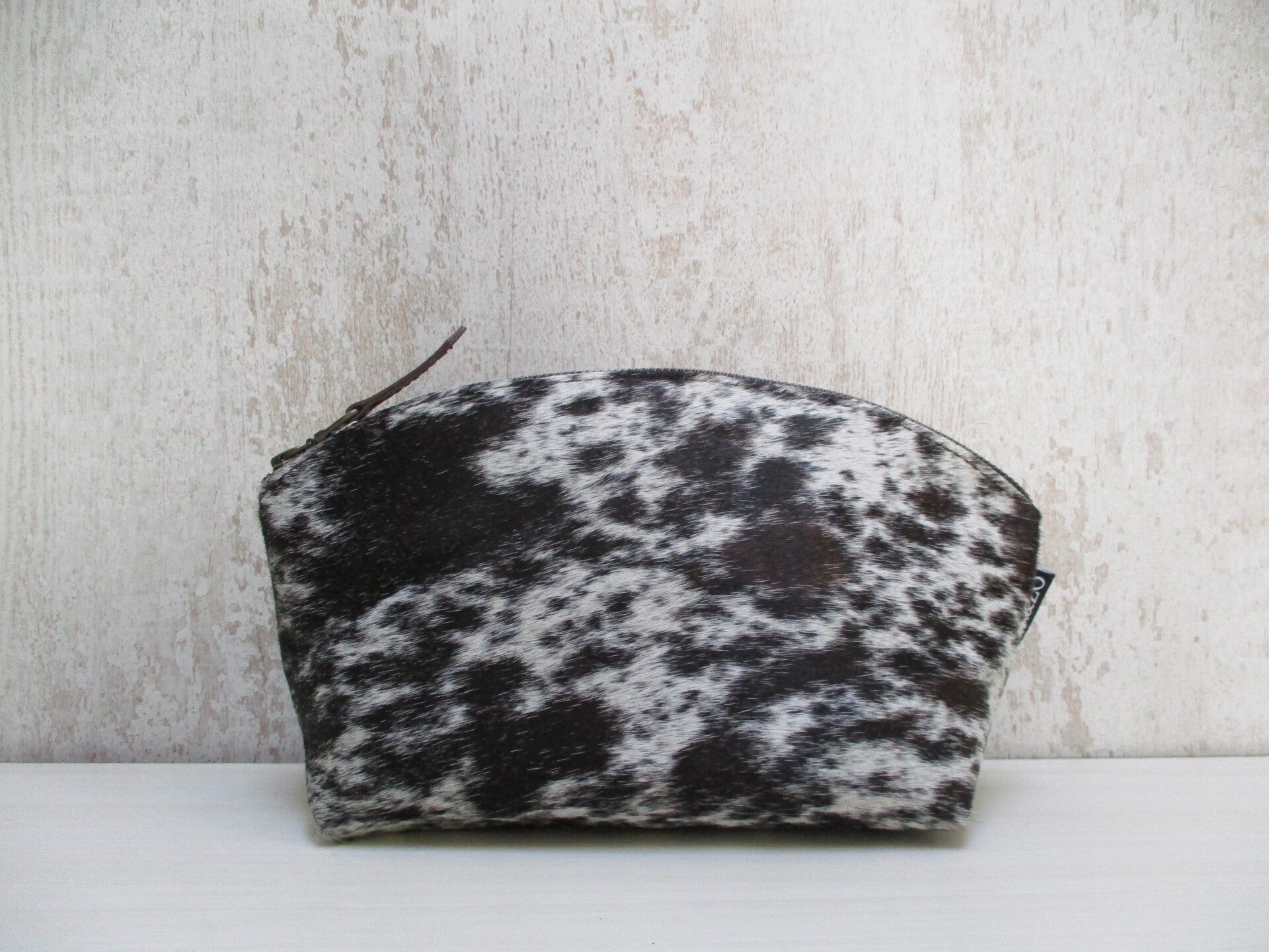 Schitterende handgemaakte ruime toilettas van sublieme kwaliteit zwart/wit/bruin koeienhuid. Het is een handig rond model waardoor je een goed overzicht hebt op al je make-up en toilet spulletjes. Door de brede bodem is de toilettas lekker ruim, en aan de bovenzijde voorzien van stevige YKK rits.