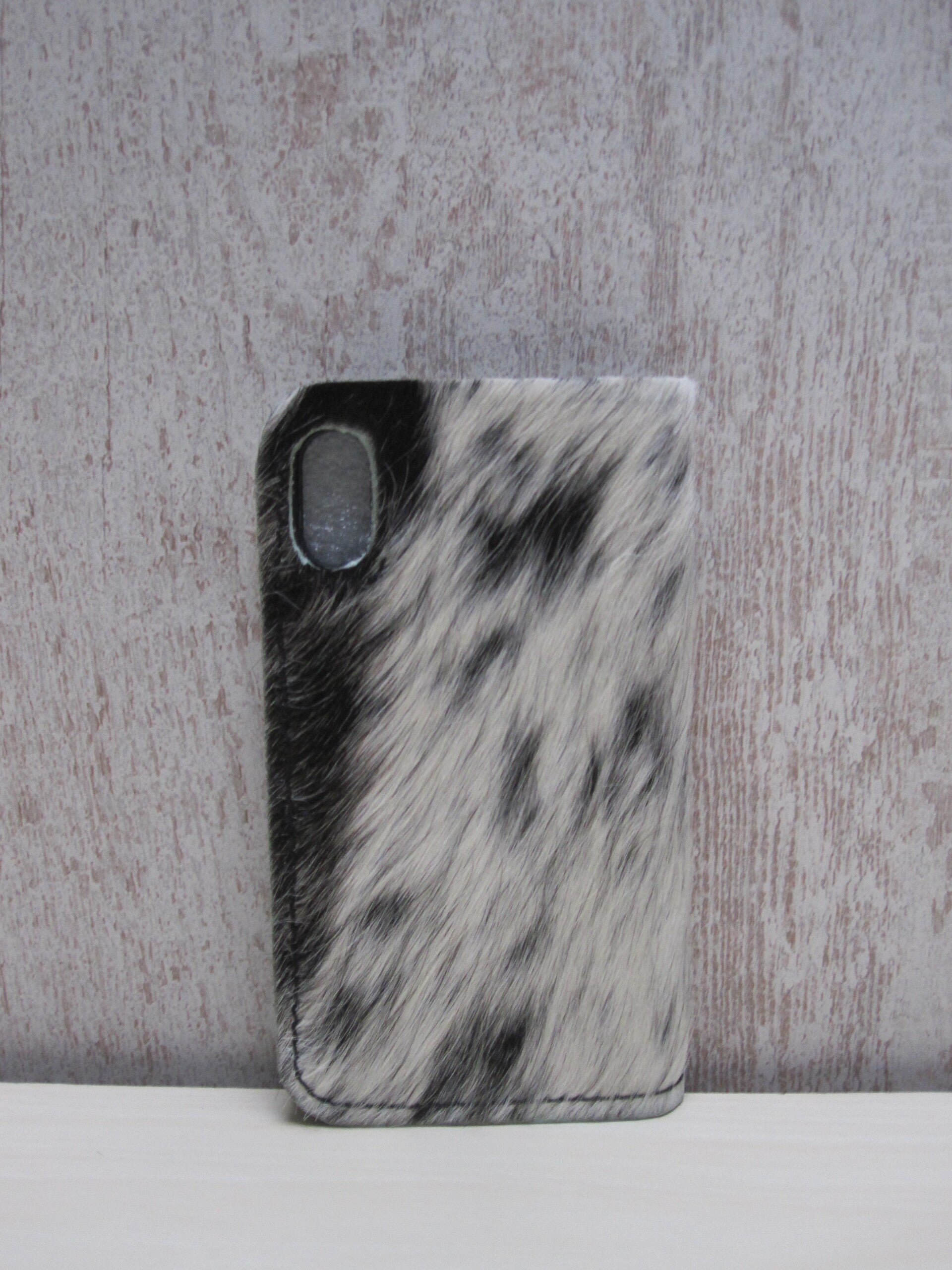 Mooie handgemaakte koeienhuid book-case geschikt voor de iPhone X en XS. De book-case is gemaakt van mooie kwaliteit zwart/wit koeienhuid. Voorzien van handige magnetische sluiting en biedt ruimt voor extra pasjes en briefgeld. En voorzien van een onbreekbare siliconen telefoonhouder.