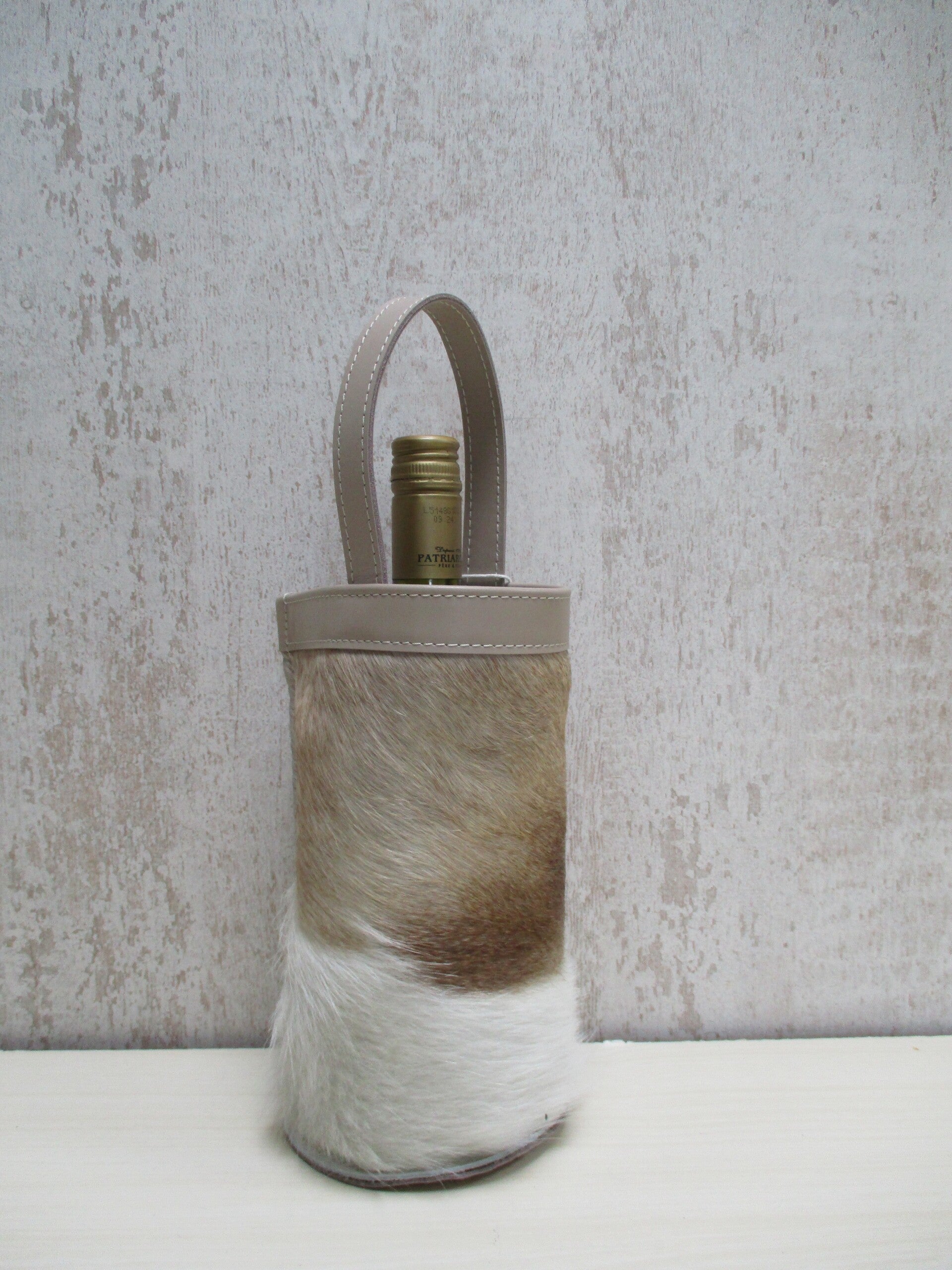 Stijlvolle en originele wijnkoeler gemaakt van een sublieme kwaliteit taupe/wit koeienhuid. De wijnkoelers van LEER&ZO zijn uniek en handgemaakt in eigen atelier. Onwijs leuk cadeau om te geven en te krijgen!