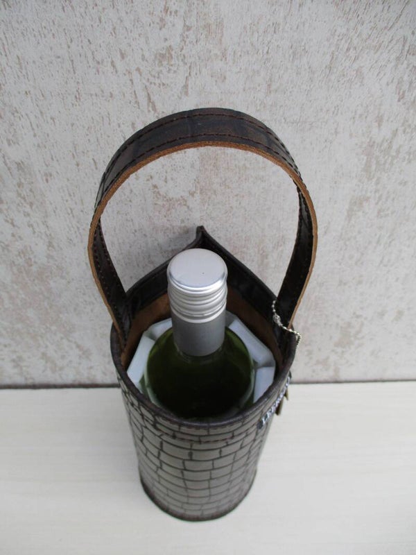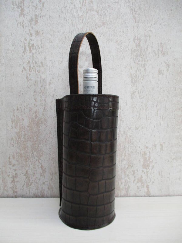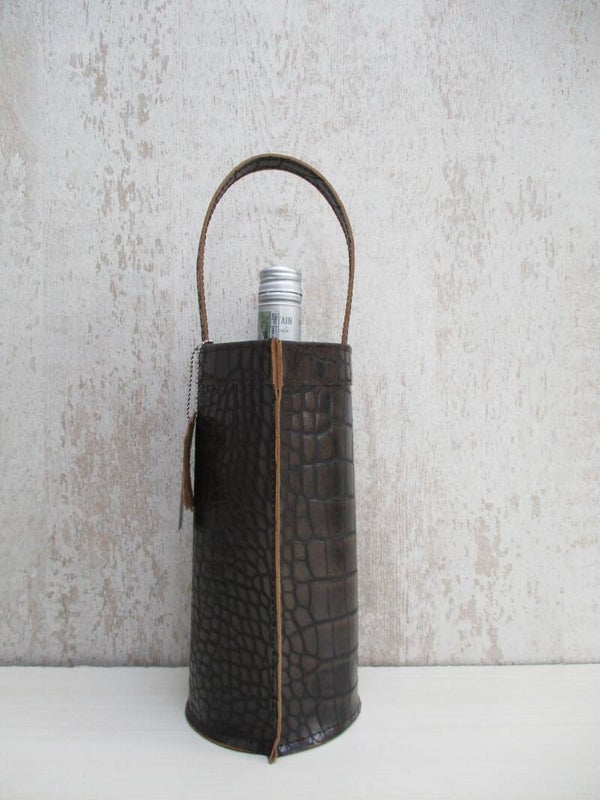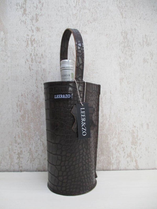 Stijlvolle en originele wijnkoeler gemaakt van een sublieme kwaliteit donkerbruin/brons leer met crocoprint. De wijnkoelers van LEER&ZO zijn uniek en handgemaakt in eigen atelier. Onwijs leuk cadeau om te geven of te krijgen!