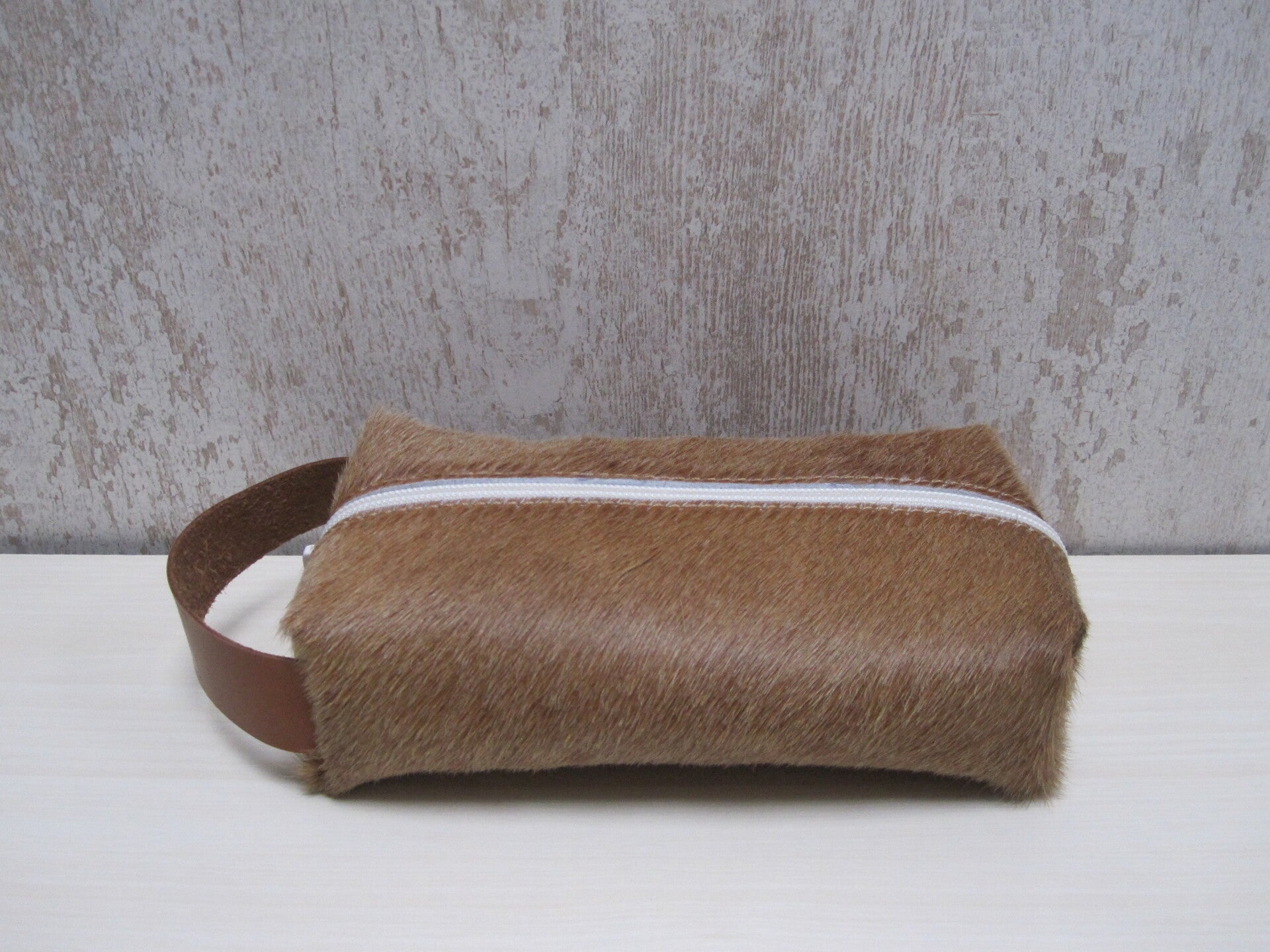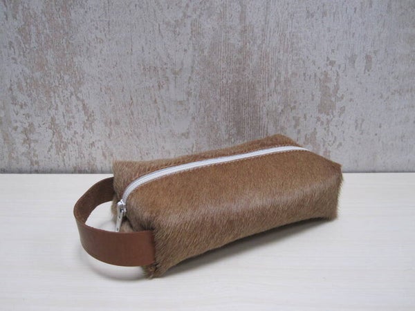 Schitterende cognac koeienhuid pennenetui waarin je veel pennen, teken- en schrijfgerei in kwijt kan. Maar ook te gebruiken als brillenetui of make-up tas. En voorzien van handige leer hengsel met uniek brandstempel en sluit doormiddel van een stevige rits.