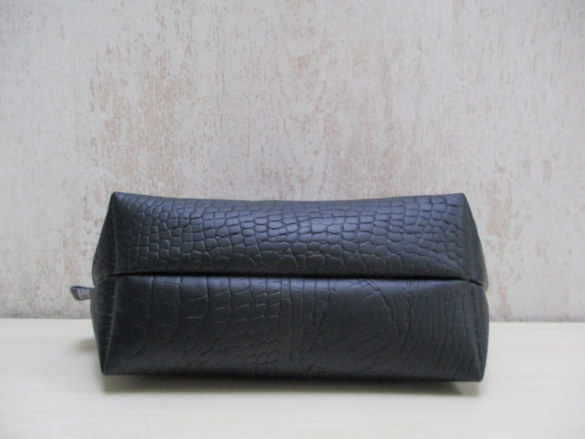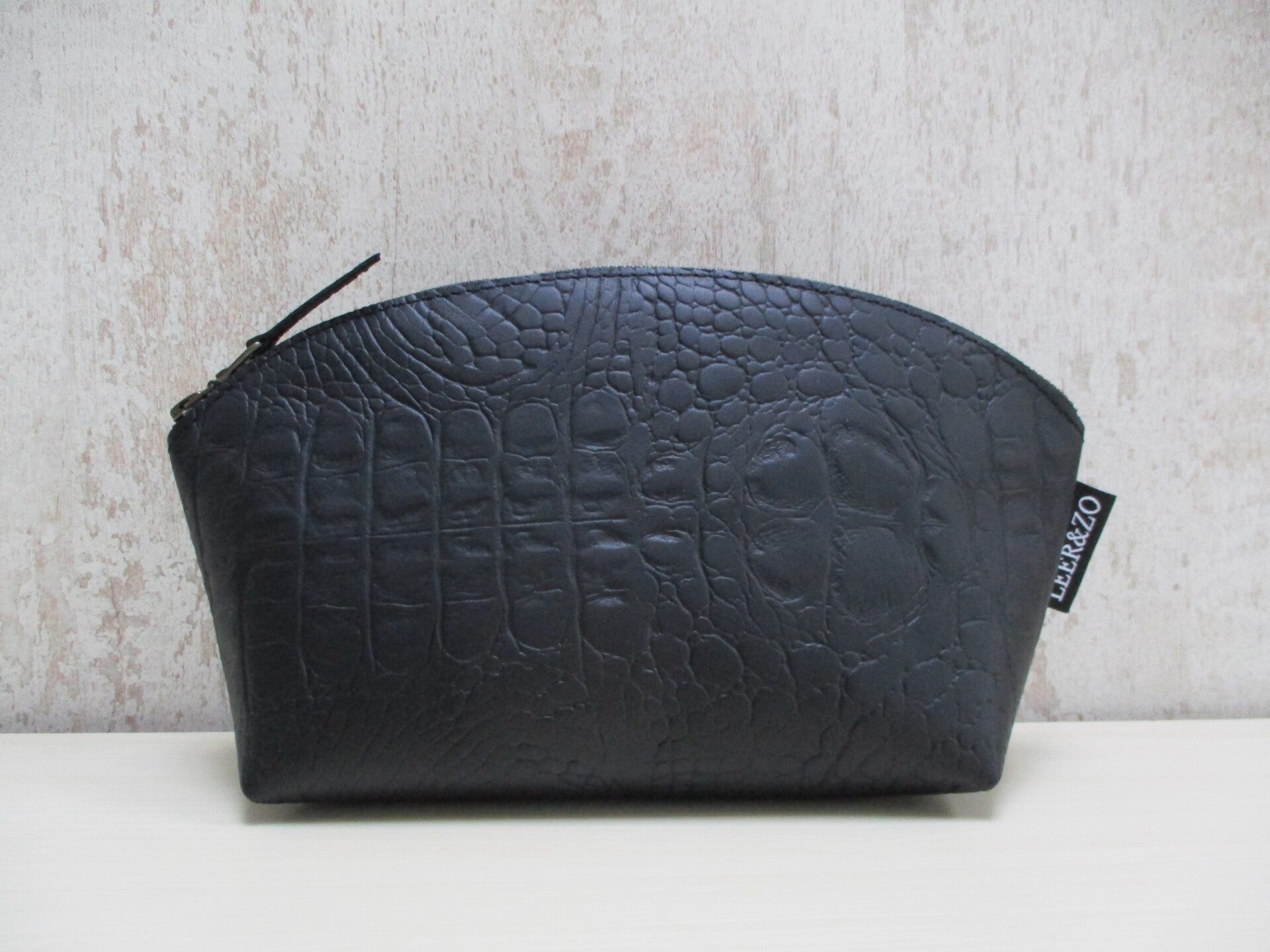 Schitterende handgemaakte ruime leren toilettas van sublieme kwaliteit zwart croco print. Het is een handig rond model waardoor je een goed overzicht hebt op al je make-up en toilet spulletjes. Door de brede bodem is de toilettas lekker ruim, en aan de bovenzijde voorzien van stevige YKK rits.