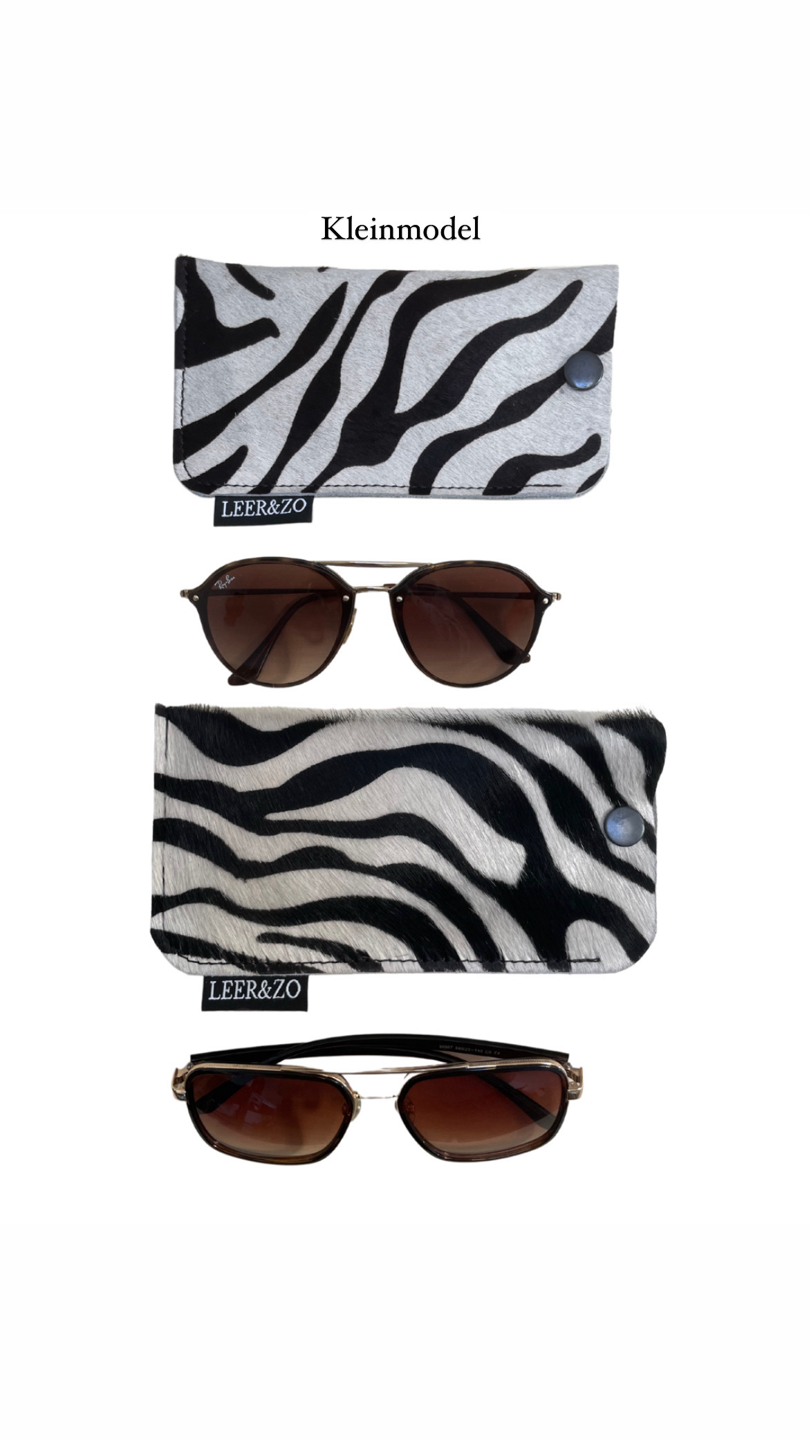 De brillenhoes is verkrijgbaar in 2 maten. Het kleinmodel is geschikt voor een standaard leesbril of Ray-ban. Het grotere model is voor de grotere zonnebrillen.