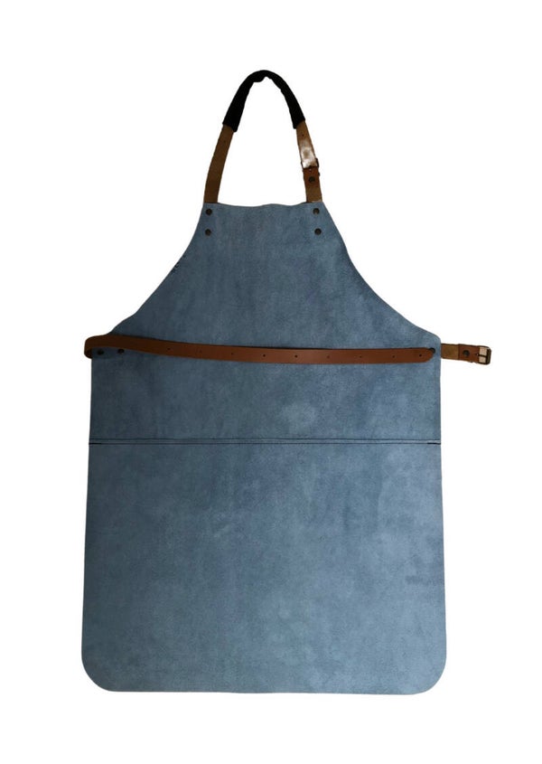 Stoer leer BBQ short gemaakt van mooi soepel donkerblauw leer. Het short heeft handige verstelbare bandjes die je met gespen vast kan zetten. En op de nek nog een extra versteviging. Perfect cadeau voor opa, papa en voor Vaderdag!
