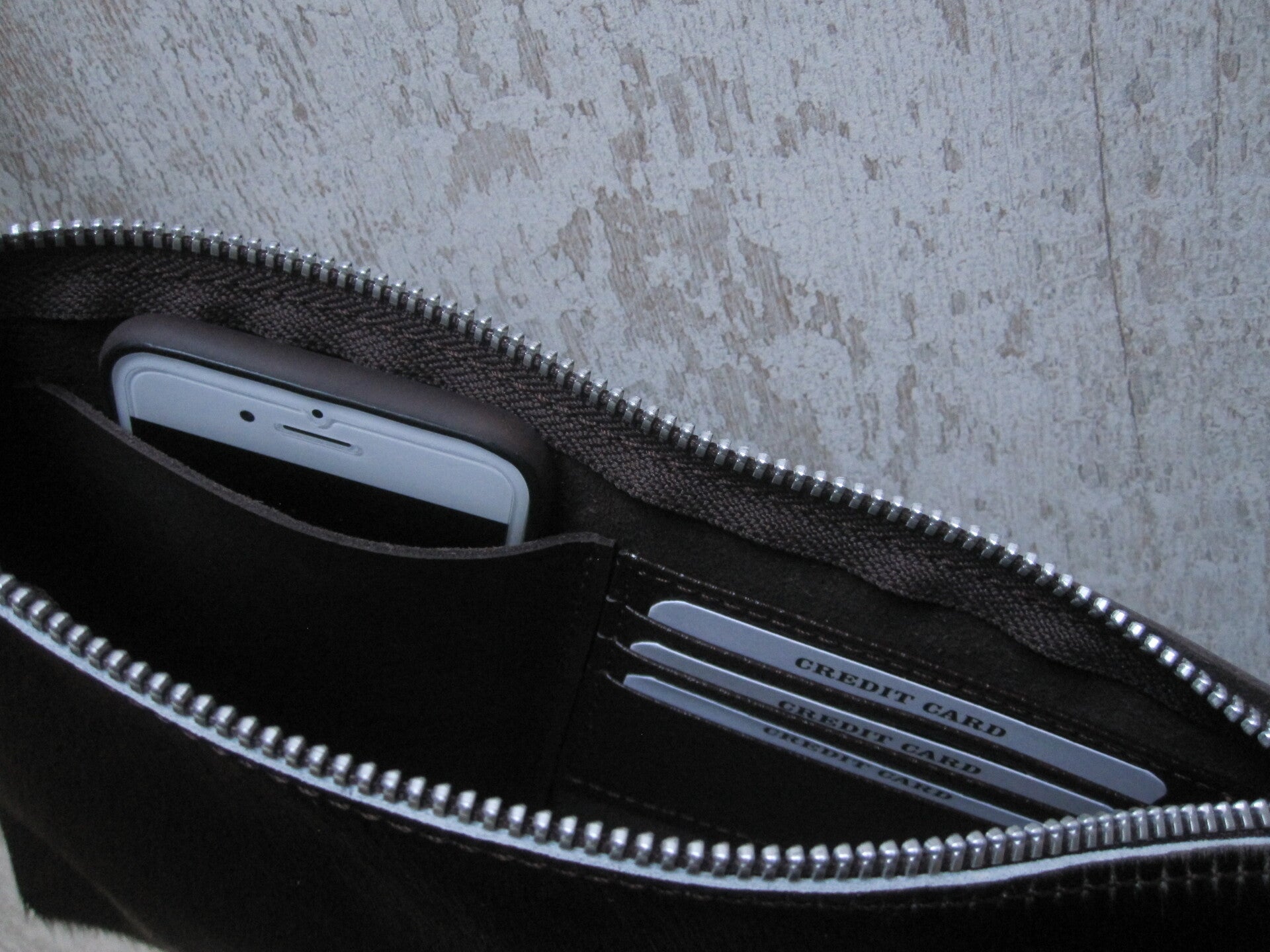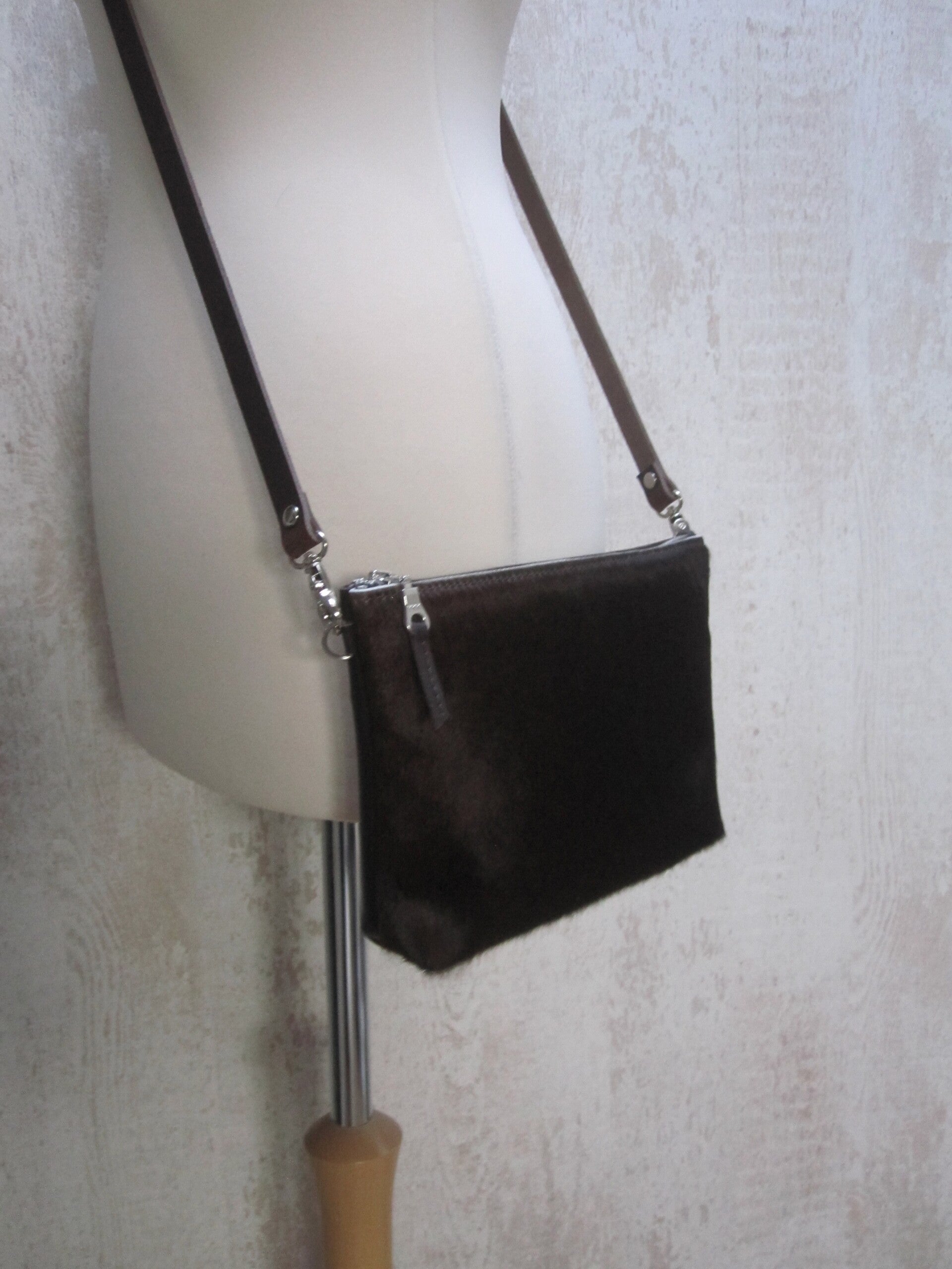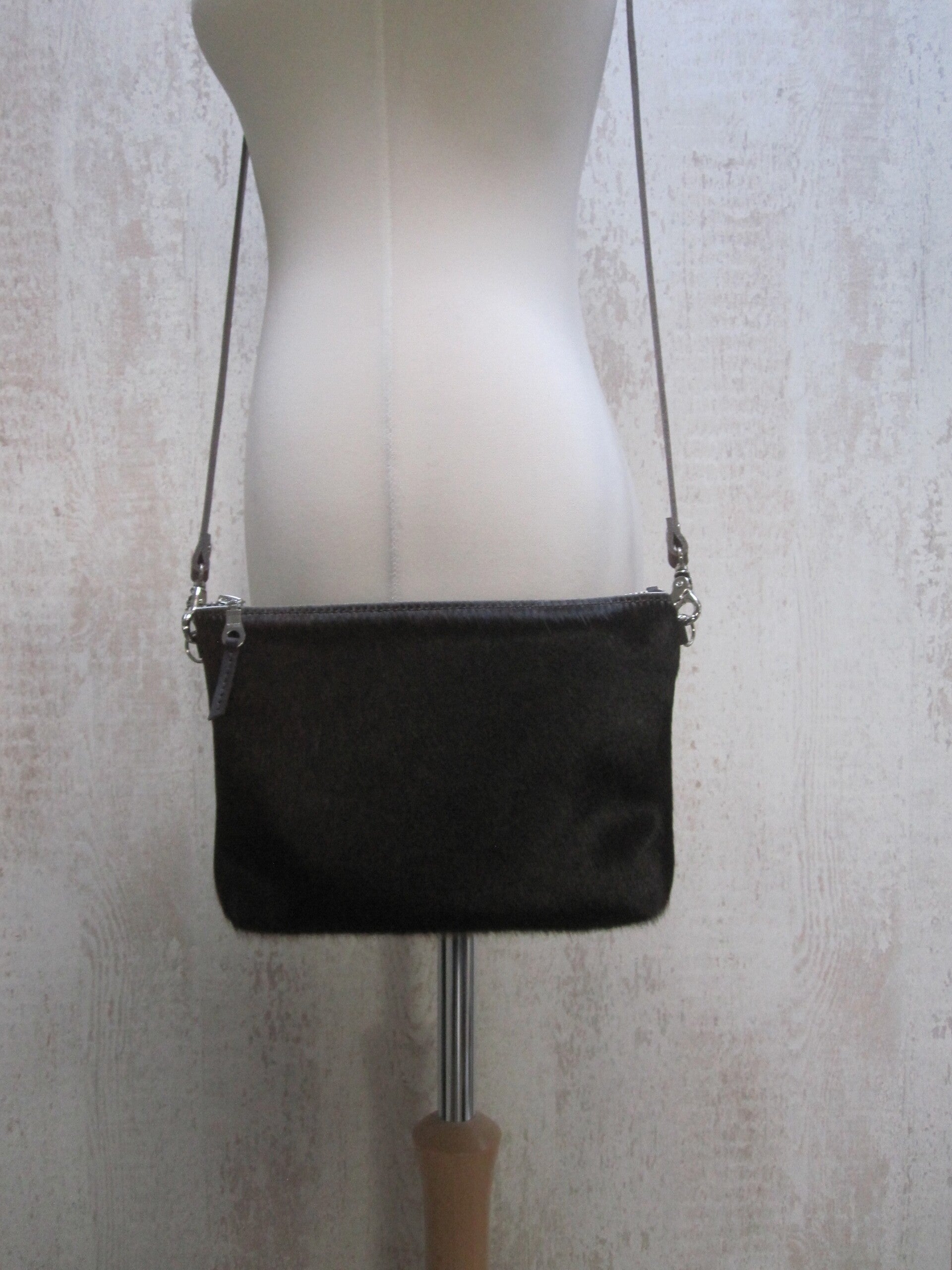 Dit schoudertasje met donkerbruin koeienhuid is heerlijk ruim. En heeft ruimte genoeg voor je portemonnee, sleutels, bril en nog veel meer. De achterzijde is van mooi donkerbruin leer. Aan de binnenzijde zit er een vakje voor bijvoorbeeld mobiel en 2 handig vakken voor pasjes. Het tasje sluit doormiddel van een rits.